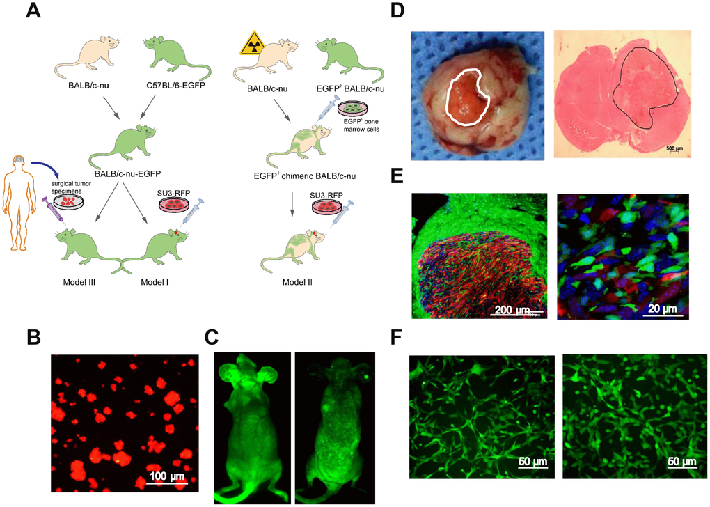 Next, we generated GSC-MSC interaction models, as shown in the schematic diagrams in Figure 2A. Human GSCs (SU3 cells) were stably transfected with the red fluorescent protein (RFP) gene, and the SU3-RFP cells displayed 100% RFP expression (Figure 2B). We also generated transgenic enhanced green fluorescent protein (EGFP)+ BALB/c athymic nude mice, which expressed EGFP ubiquitously, except in enucleated cells (Figure 2C, left). To generate chimeric BALB/c nude mice, we used X-ray irradiation to autologously deplete the bone marrow function of normal BALB/c nude mice, and reconstructed their bone marrow by injecting their tail veins with exogenous EGFP+ bone marrow cells harvested from the EGFP+ BALB/c athymic nude mice; thus, in the chimeric mice, only bone marrow-derived cells expressed EGFP (Figure 2C, right).