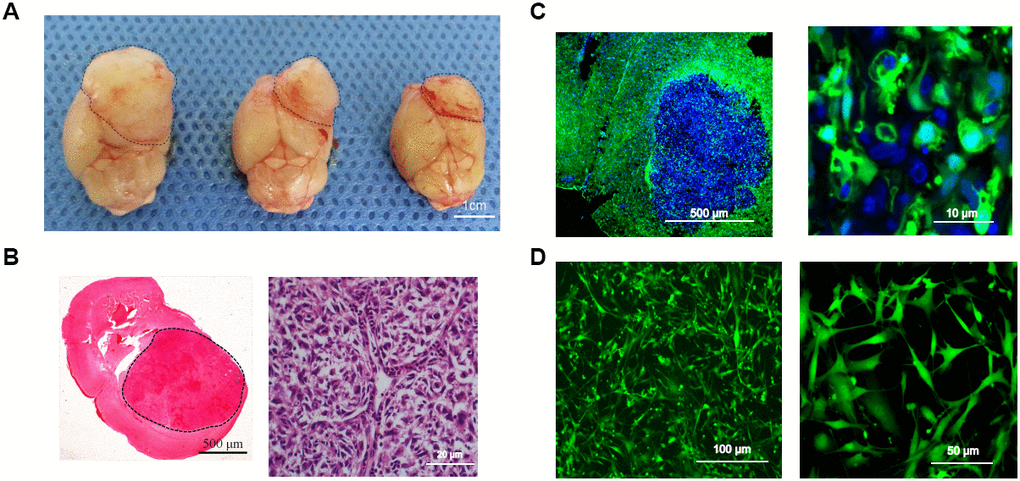 Tumor-bearing mice were sacrificed approximately 35 days after orthotopic xenotransplantation. After the intracranial xenograft tumors were harvested, pieces of the tumors were dissociated and subcultured in vitro, and other pieces were used for pathological examination. Frozen sections were stained with H&E, and 4',6-diamidino-2-phenylindole (KeyGen, Nanjing, China) was used for nuclear labeling. The sections were then observed under both a fluorescence microscope and a confocal laser scanning microscope (ZEISS, Germany).