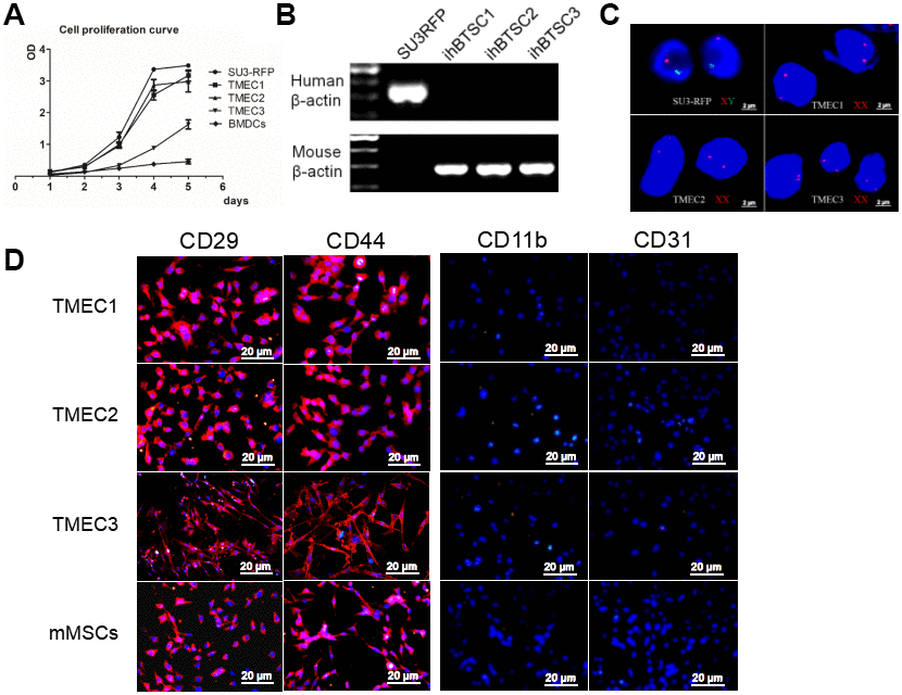 The three transformed cell lines expressed mouse β-actin, but not human β-actin (Figure 4B). A fluorescence in situ hybridization (FISH) assay of the sex chromosomes revealed that the karyotype of the SU3 cells was XY (X, red fluorescent probe; Y, green fluorescent probe) (Figure 4C), in accordance with clinical data showing that SU3 cells were derived from a male patient [23, 24]. The karyotypes of all three transformed cell lines were XX, consistent with the karyotypes of the female host mice (Figure 4C). Immunofluorescence assays demonstrated that TMEC1, TMEC2 and TMEC3 cells expressed biomarkers of MSCs, as the cells were positive for CD29, CD44, CD105 and CD90 but negative for CD11b, CD31, CD34 and CD45. Normal MSCs were used as the positive control (Figure 4D and Supplementary Figure 2F).