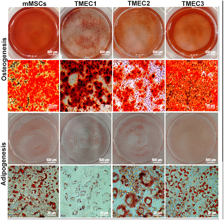 We then performed an osteogenic differentiation assay, and found that mineralized nodules emerged from all three cell lines after seven days of differentiation induction. When we conducted an adipogenic differentiation assay, small fat droplets gradually coalesced into large fat droplets after seven days of differentiation induction, and brown adipose tissue deposition occurred after 14 days of in vitro induction. These multidirectional differentiation assays confirmed that TMEC1, TMEC2 and TMEC3 cells were transformed BMSCs and still had differentiation potential. Specifically, TMEC1 cells exhibited obvious osteogenic and slight adipogenic differentiation potential, TMEC2 cells exhibited notable adipogenic differentiation potential, and TMEC3 cells exhibited strong osteogenic and adipogenic differentiation potential, similar to those of normal MSCs (Figure 5). These data suggested that the three transformed EGFP-expressing TMEC lines from the different models were BMSCs; thus, these cells were named transformed MSCs (tMSC1, tMSC2 and tMSC3 for Models I, II and III, respectively).