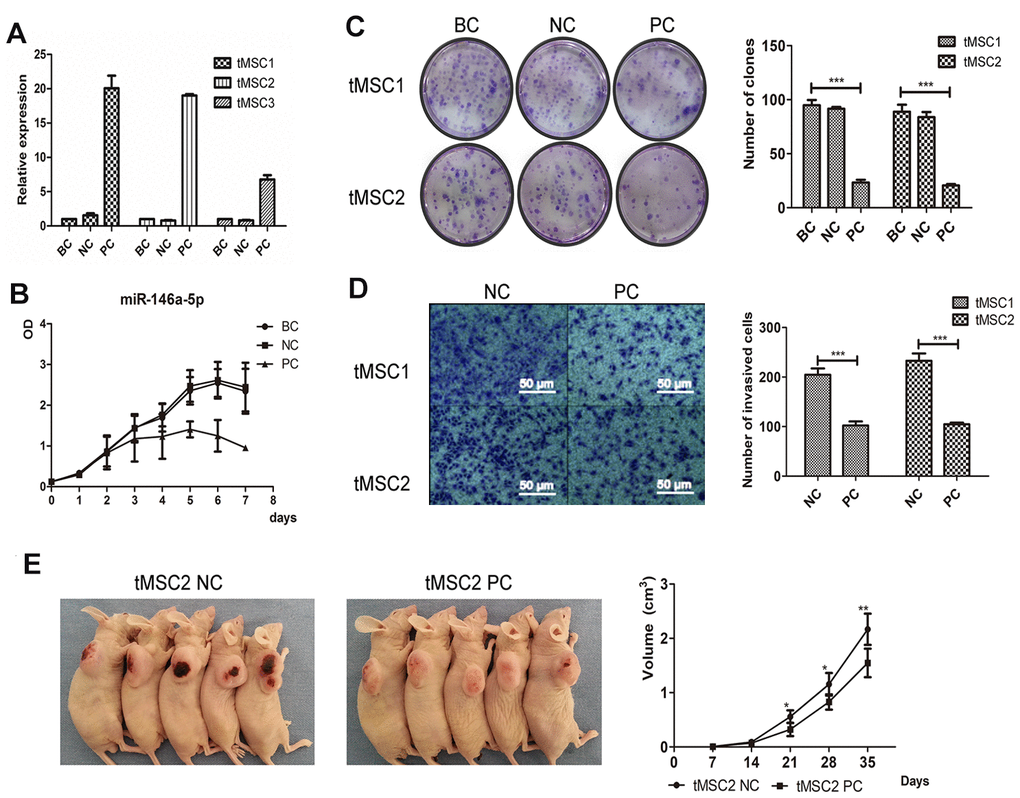 Next, we used lentiviral vectors to overexpress miR-146a-5p in the three tMSC lines. The transfection induced miR-146a-5p expression 20.06-fold, 19.02-fold and 6.79-fold in tMSC1, tMSC2 and tMSC3 cells, respectively (Figure 7A). Cell proliferation was significantly lower in miR-146a-5p-overexpressing tMSC1 (PC) cells than in the blank control (BC) and negative control (NC) cells (Figure 7B). Overexpression of miR-146a-5p in tMSC1 and tMSC2 cells reduced their colony formation abilities in a colony formation assay (P<0.001); the colony numbers of blank control, negative control and miR-146a-5p-overexpressing tMSC1 cells were 94.75±4.32, 91.50±1.50 and 23.25±2.17, while those of blank control, negative control and miR-146a-5p-overexpressing tMSC2 cells were 88.75±5.63, 83.75±4.15 and 20.50±1.12, respectively (Figure 7C). The invasion abilities of tMSC1 and tMSC2 cells also decreased significantly after miR-146a-5p overexpression (P<0.001) (Figure 7D). The tumors generated from miR-146a-5p-overexpressing tMSC1 cells were appreciably smaller in volume than the tumors generated from control cells 28 days after their subcutaneous transplantation into BALB/c nude mice (Figure 7E).