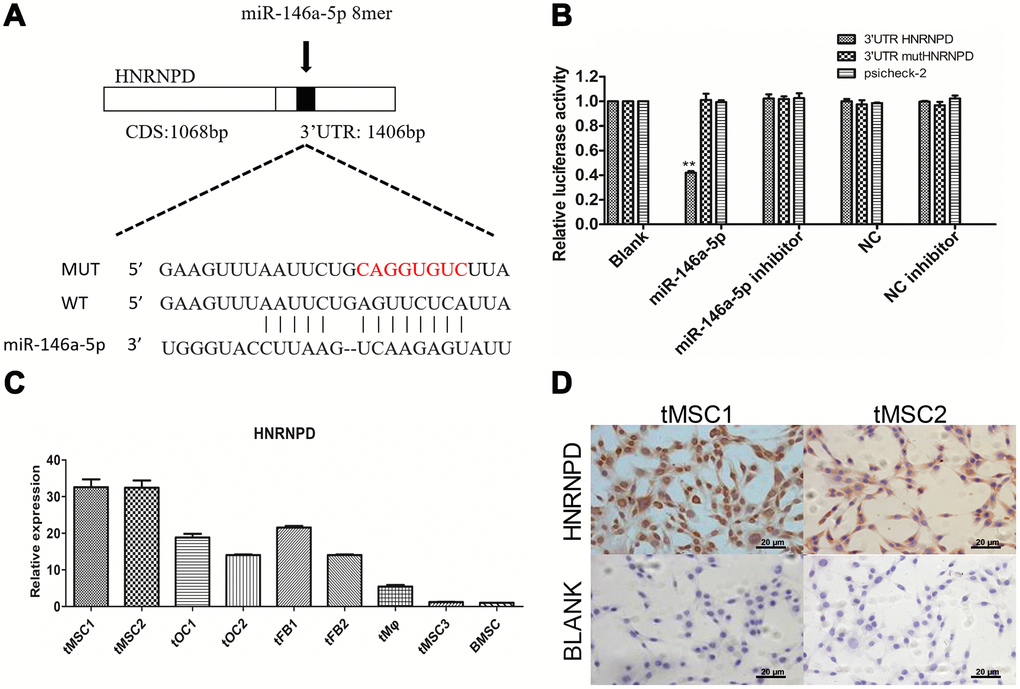 We then performed target gene prediction on the nine differentially expressed miRNAs validated in this study, and conducted Gene Ontology (GO) analyses (top 30 shown in Supplementary Figure 8A) and Kyoto Encyclopedia of Genes and Genomes (KEGG) pathway analyses (top 20 shown in Supplementary Figure 8B). The TargetScan prediction database identified heterogeneous nuclear ribonucleoprotein D (HNRNPD) as a target gene of miR-146a-5p (Figure 8A). In a luciferase reporter gene assay, miR-146a-5p significantly repressed the expression of HNRNPD by binding to its 3' untranslated region (UTR) (P<0.01). Luciferase activity was not detected in the negative control group (containing a mutated 3'UTR of HNRNPD) or the blank group, suggesting that miR-146a-5p specifically binds to the 3'UTR of HNRNPD (Figure 8B). HNRNPD mRNA was significantly upregulated in tMSC1 and tMSC2 cells compared with BMSCs (Figure 8C), but was not highly expressed in tMSC3 cells. Immunocytochemical staining of tMSC1 and tMSC2 cells further verified the high expression of HNRNPD at the protein level, consistent with the transcriptional results (Figure 8D).