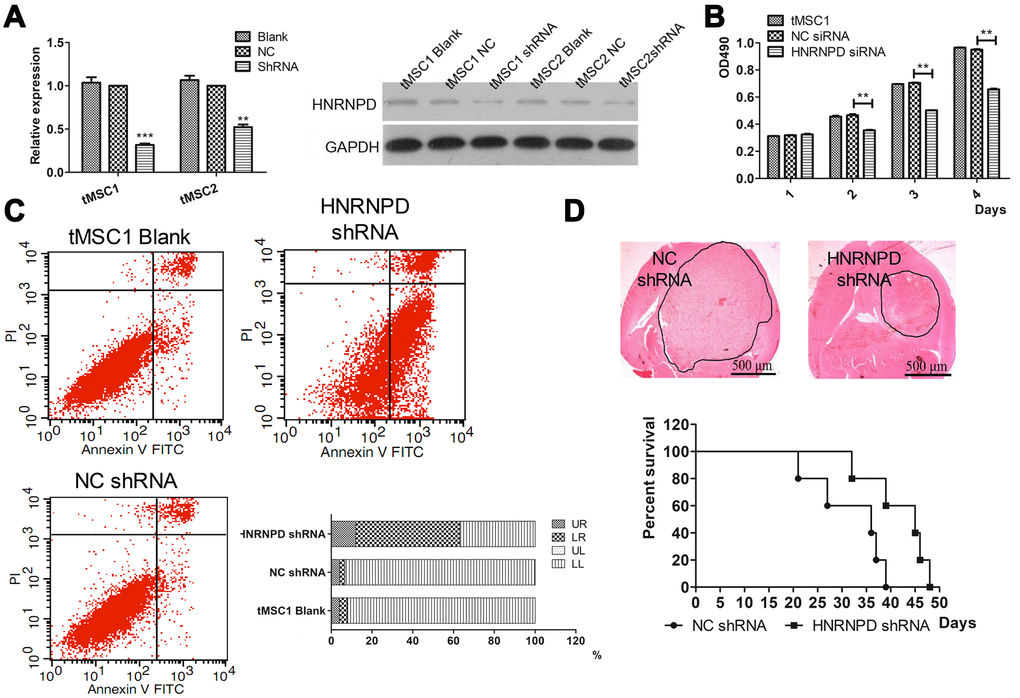 To further study the involvement of HNRNPD in the transformation of MSCs, we used small interfering RNA (siRNA) to downregulate HNRNPD in tMSC1 cells. Western blotting confirmed that HNRNPD protein expression was downregulated in the siRNA-treated cells (Figure 9A). The siRNA also significantly inhibited cell proliferation, as shown in an MTS assay (Figure 9B).