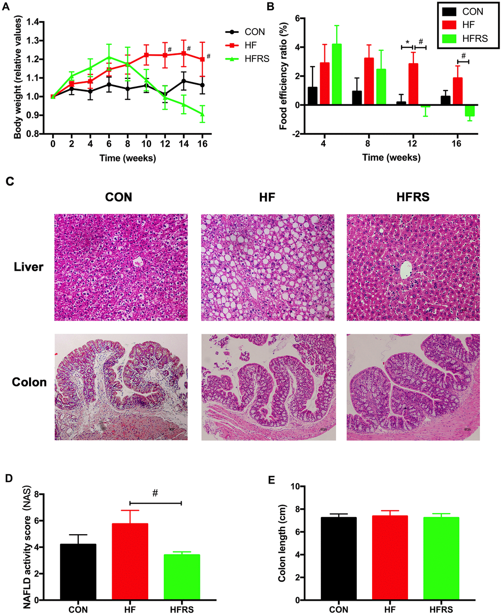 At 12 weeks, a trend towards weight gain was observed in the HF compared to the control group (p=0.06). However, the weight gain was counteracted in the HFRS (high-fat diet+20% RS2) group at 12 weeks and beyond (p<0.05, Figure 1A). Furthermore, food efficiency ratio was higher in the HF compared to the control group at 12 weeks, and lower in the HFRS compared to the control group at 12 and 16 weeks (p<0.05, Figure 1B). Liver histopathology demonstrated higher non-alcoholic fatty liver disease (NAFLD) activity in the HF group compared to the HFRS group (p<0.05, Figure 1C, 1D). No differences in colon histopathology scores and colon length were found among the three groups (Figure 1C, 1E).