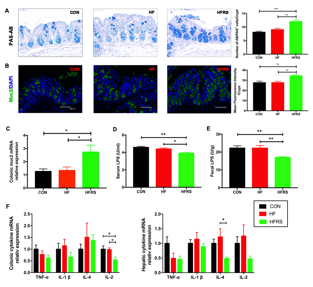 Mucin expression levels in colon, lipopolysaccharide (LPS) concentration in blood and stool, and inflammatory cytokines mRNA expression levels in colon and liver of each group were examined. RS2 supplementation increased the colonic MUC2 expression of protein (Figure 2A, 2B) and mRNA (2.73+0.52 in HFRS vs. 1.34+0.26 in HF group, p=0.03; 2.73+0.52 in HFRS vs. 1.27+0.19 in control, p=0.02, Figure 2C) in the HFRS group compared to the HF and the control groups. Furthermore, RS2 supplementation reduced LPS levels in serum (3.92+0.10 in HFRS vs 4.40 + 0.11 in HF, p=0.02; 3.92+0.10 in HFRS vs 4.59+0.10 in control, p=0.001, Figure 2D) and stool (17.01+0.44 in HFRS vs 22.25+1.47 in HF, p=0.008; 17.01+0.44 in HFRS vs 22.27+1.26 in control, p=0.008, Figure 2E) of the HFRS compared to the HF and the control groups.