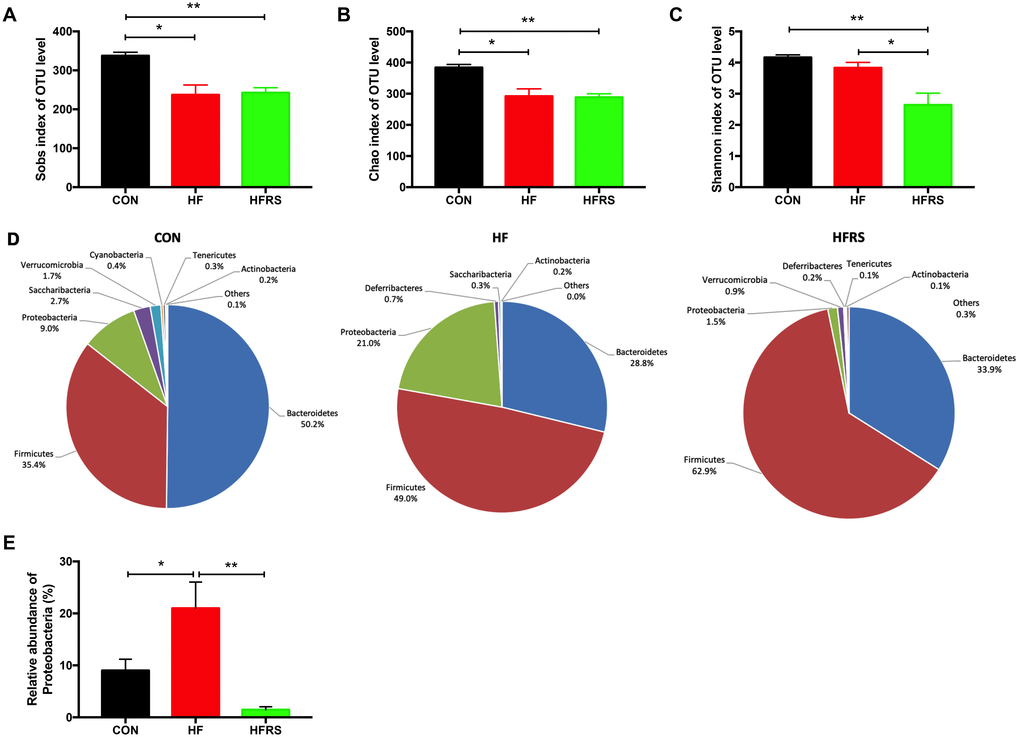 To evaluate the impact of dietary interventions on gut microbiota, 16s rRNA sequencing of the mice fecal DNA were performed at 16 weeks. The microbiota analysis showed that high-fat diet reduced the richness of microbiota (Sobs and Chao1 index in OTU level, Figure 3A, 3B) but not diversity (Shannon index in OTU level, Figure 3C). No difference in richness was observed between the HFRS and the HF groups. However, HFRS demonstrated reduced diversity compared to the HF and the control groups (P<0.05, Figure 3C).