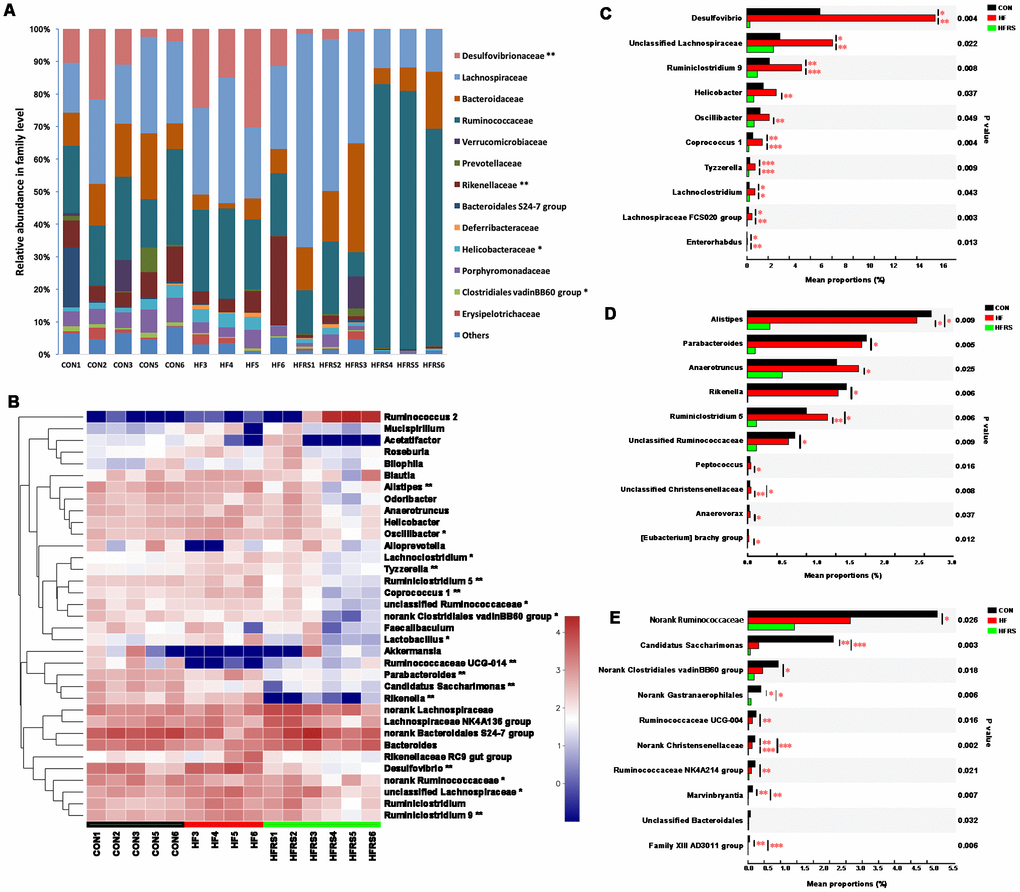 Abundance of bacteria at the phylum level by the groups were analyzed (Figure 3D). Higher relative abundance of Proteobacteria was observed in the HF compared to the control group (21.00% vs. 9.01%, P<0.05, Figure 3E). However, HFRS had lower relative abundance of Proteobacteria compared to both the HF (1.47% vs. 21.00%, P<0.01) and the control (1.47% vs. 9.01%, P<0.01) groups (Figure 3E). Further analysis at the family and genus levels demonstrated that the abundance of bacteria including Bacteroidetes (i.e. Rikenellaceae, Parabacteroides, Alistipes), Firmicutes (i.e. Clostridiales vadinBB60 group, Ruminiclostridium 9, Ruminiclostridium 5, Oscillibacter, Coprococcus 1, Lactobacillus, Tyzzerella, Lachnoclostridium), and Proteobacteria (e.g. Desulfovibrionaceae, Helicobacteraceae) species were different among the three groups (p<0.05, Figure 4A, 4B).