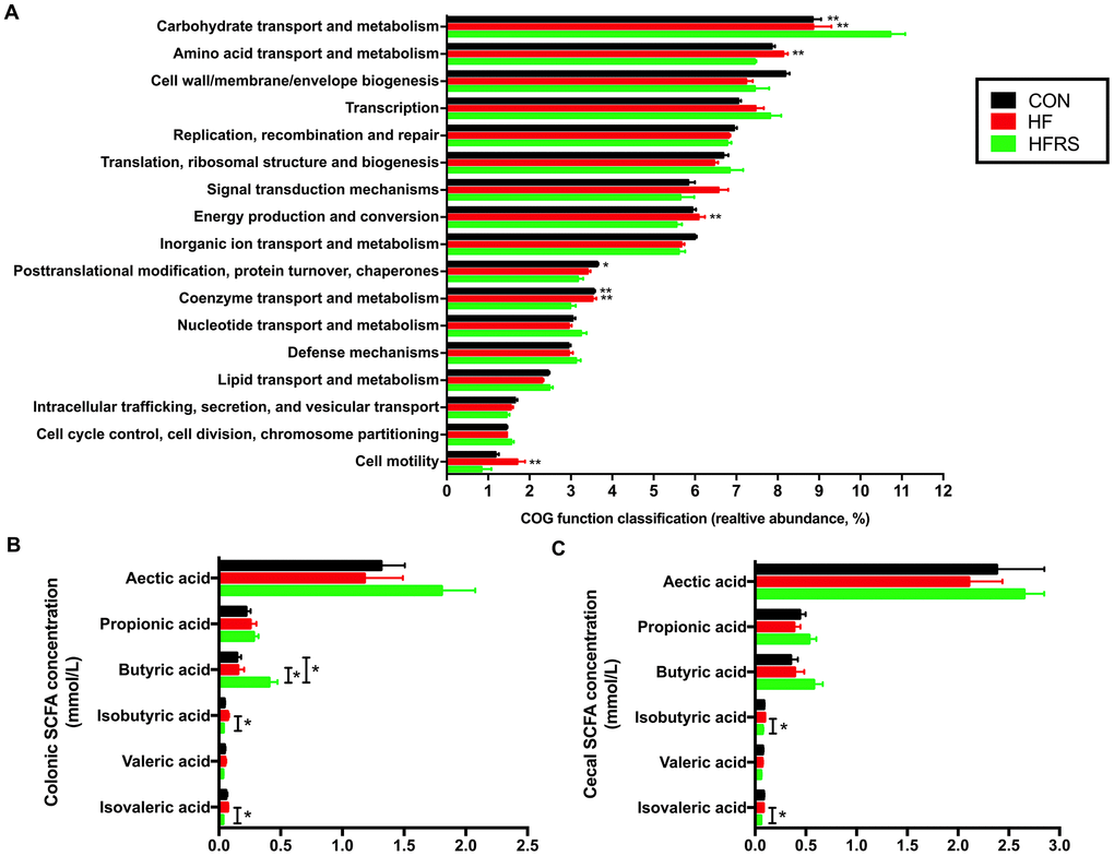 Evaluation of SCFA showed that the HFRS group had higher levels of butyric acid in colon compared to the HF and the control groups (p<0.05, Figure 5B). Meanwhile, HFRS group had lower concentrations of isobutyric and isovaleric acids in the cecum and colon compared to the HF group (p<0.05, Figure 5B, 5C).