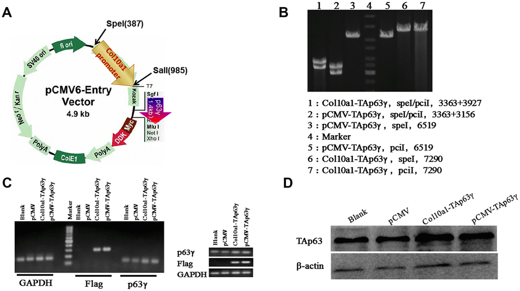 The TAp63γ expression plasmid (pCMV-TAp63γ) MR227536 was purchased from Origene. TAp63γ was cloned into the pCMV-entry between multiple restriction sites: SgfI and MluI. Col10a1-TAp63γ was generated by replacing the CMV promoter with the hypertrophic chondrocyte-specific Col10a1 enhancer/promoter element [15] via SpeI and SalI double digestion (Figure 1A). Figure 1B shows confirmation of the clones by enzyme digestion.