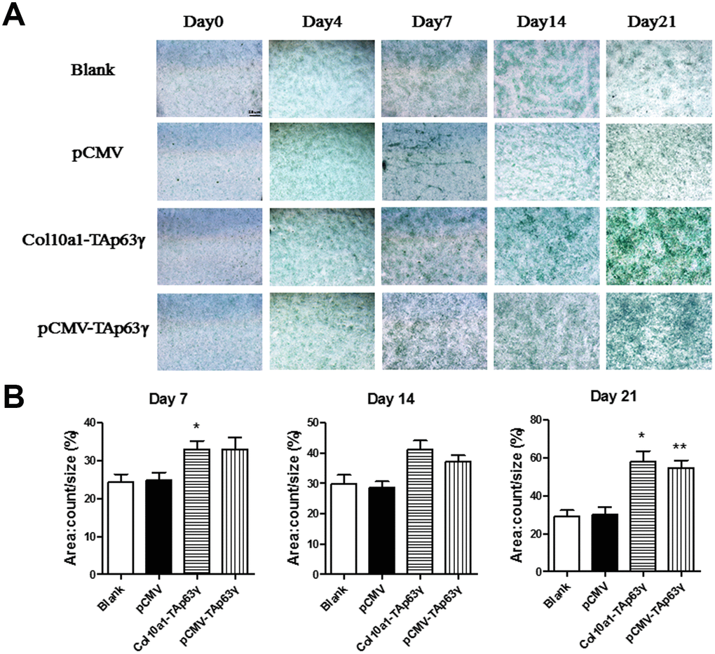 Cells cultured for 0, 4, 7, 14, and 21 days were subjected to Alcian blue staining. Enhanced staining was observed in TAp63γ stable cell lines cultured for 7 days or longer compared to control cells (Figure 3), suggesting that TAp63γ promotes chondrocyte proliferation in vitro.