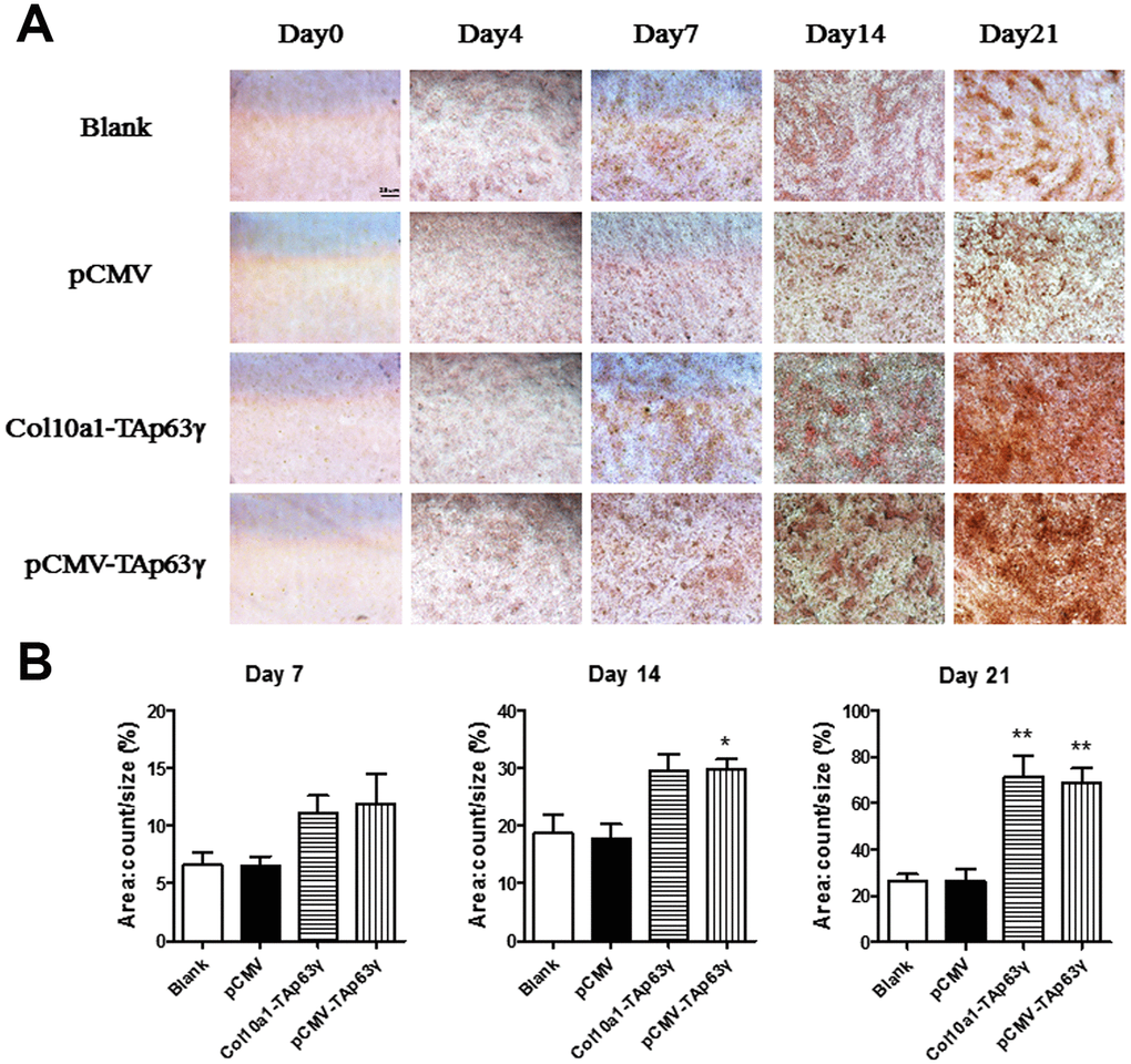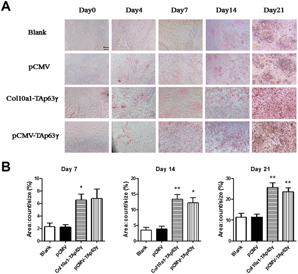 We also performed Alizarin red staining in cells cultured for 0, 4, 7, 14, and 21 days. Enhanced staining was demonstrated in both Col10a1-TAp63γ and pCMV-TAp63γ stable cell lines compared with the control cells (Figure 5), suggesting that TAp63γ may promote matrix mineralization.