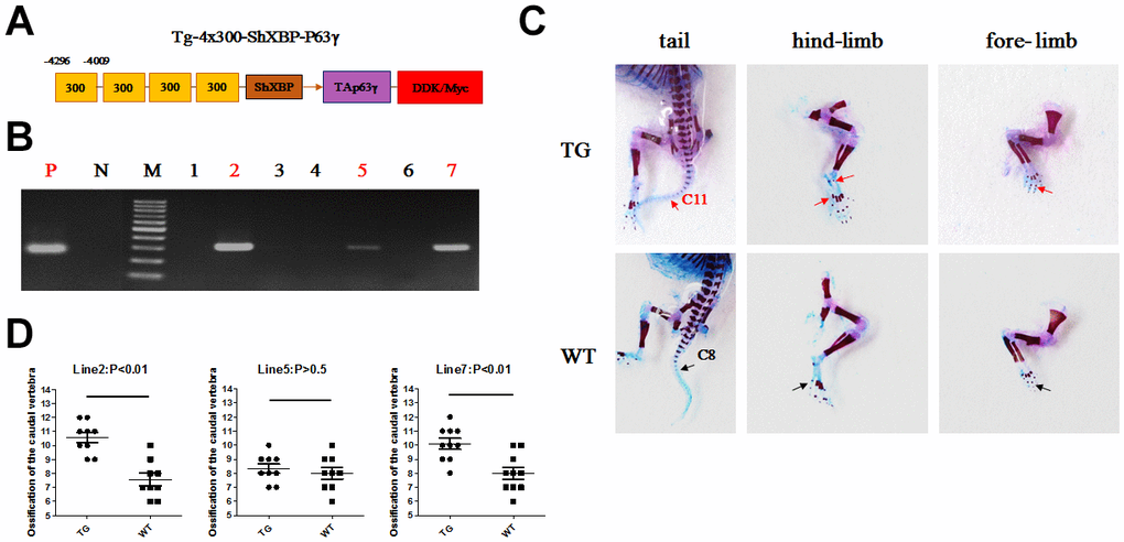 The Col10a1 distal promoter and the shorter Col10a1 basal promoter (from −220 to +45 bp) elements were used to generate a p63γ expressing transgenic construct. Generation of transgenic mice was conducted at Lannuo Biotechnologies Wuxi, Inc (Figure 6A). PCR genotyping was performed for the Col10a1-TAp63γ transgenic mice using DNA prepared from skin. Lanes 2, 5, and 7 were Col10a1-TAp63γ transgenic mice, and lanes 1, 3, 4, and 6 were wild-type littermates (WT mice) (Figure 6B). Mice at postnatal day 1 (P1) were analyzed for ossification of the fore- and hind-limb digits. Ossification was apparent in some digits of transgenic mice but not in WT littermates. Moreover, tail ossification was evident up to the 11th caudal vertebra in transgenic mice; whereas, significantly delayed ossification could only be observed up to the 8th caudal vertebra in WT littermates in two of the transgenic mouse lines (p<0.05, Figure 6C, 6D).