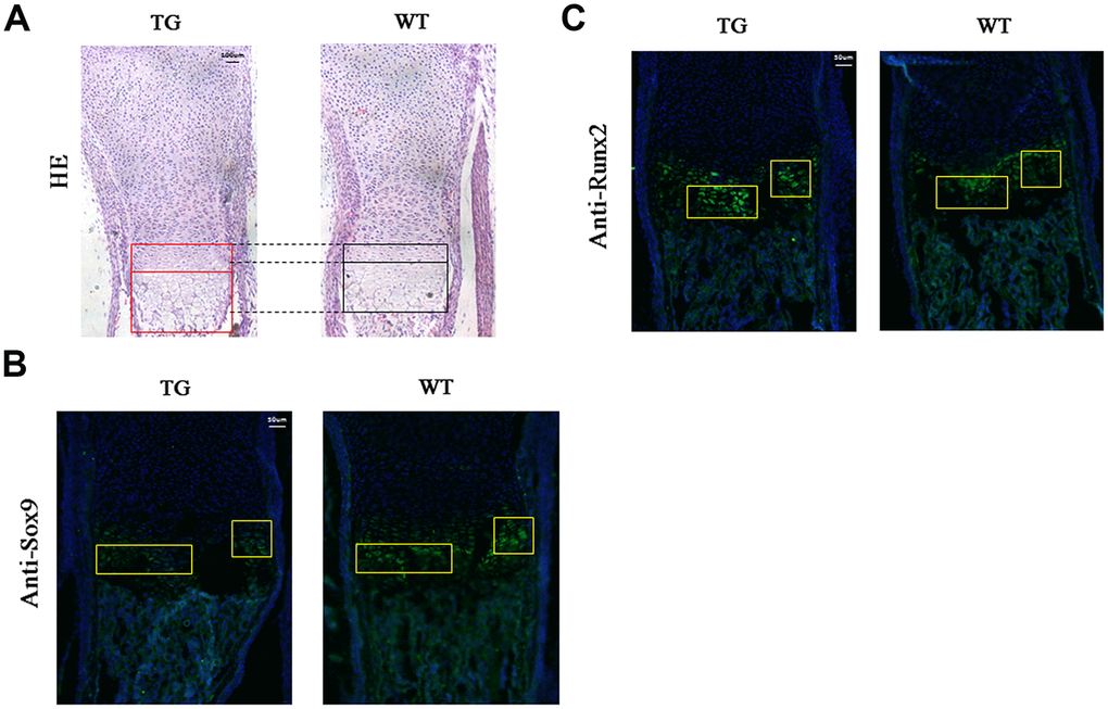 Mouse limbs were collected at P1 stage and subjected to hematoxylin and eosin (H&E) or immunofluorescent staining. H&E staining demonstrated that the proliferative and hypertrophic zones of the limb cartilage were significantly increased in the transgenic mice compared to the WT littermates (Figure 7A). Sagittal sections of the distal humerus from both WT and transgenic mouse limbs at P1 were subjected to immunofluorescent analysis using an anti-Sox9 antibody. Reduced green fluorescence, indicating down-regulation of Sox9 expression, was observed in the proliferative and hypertrophic zones of transgenic mice compared to WT controls (Figure 7B). Meanwhile, increased green fluorescence, indicating up-regulation of Runx2 expression, was observed in the hypertrophic zone of transgenic mice compared to their littermate controls (Figure 7C).