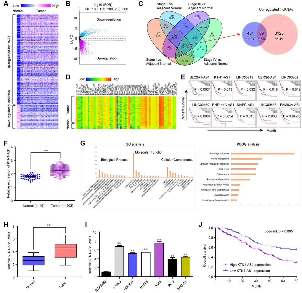 To clarify the potential lncRNAs which played oncogenic roles in NSCLC, we first analyzed the TCGA dataset and found the differentially express (DE) lncRNAs in NSCLC tumor samples. The heatmap and volcano map of these DE lncRNAs were shown in Figure 1A, 1B. Afterwards, we searched Cancer RNA-seq Nexus program and obtained the lncRNAs which expressed in all stages (from stage I to IV) of NSCLC. These lncRNAs were intersected with the up-regulated lncRNAs in NSCLC tumor specimens which were analyzed using TCGA data, and 59 lncRNAs were found to be in both sides (Figure 1C). The expression (heatmap) of these 59 lncRNAs in NSCLC samples using TCGA data analysis was presented in Figure 1D. Thereafter, we searched GEPIA algorithm and found that only 10 of these 59 lncRNAs were significantly correlated with overall survival rates in NSCLC patients using TCGA data analysis (Figure 1E). Among these 10 lncRNAs, we next selected KTN1-AS1, a novel lncRNA, to further study. The levels of KTN1-AS1 in NSCLC samples were analyzed using TCGA data and KTN1-AS1 was remarkably up-regulated in NSCLC tumor tissues (Figure 1F). Subsequently, gene ontology (GO) and KEGG pathway analysis using Co-lncRNA program revealed that KTN1-AS1 was notably associated with pathways in cancers (Figure 1G). Next, qPCR was applied for detecting the levels of KTN1-AS1 in 127 NSCLC samples and KTN1-AS1 was also found to be markedly up-regulated in NSCLC tumor tissues (Figure 1H). In addition, the data from qPCR analyses suggested that lung cancer cells also expressed high KTN1-AS1 levels (Figure 1I). Then, we also explore the clinical significance of KTN1-AS1 in our cohort, finding that high expression of KTN1-AS1 was associated with TNM stage (p = 0.0029), Histological grade (p= 0.012) and lymph node metastasis (p = 0.020) (Table 1). Further survival assays also suggested that patients with high KTN1-AS1 expression had a shorter overall survival time than those with low KTN1-AS1 expression (p = 0.005, Figure 1J). More importantly, the results of multivariate assays suggested that KTN1-AS1 expression was an independent poor prognostic factor for five-year overall survival of NSCLC patients (HR=2.775, 95% CI: 1.282-4.219, p = 00021) (Table 2). Overall, the data indicated that KTN1-AS1 was highly expressed in NSCLC tumor specimens and predicted poor prognosis.