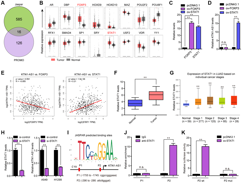 Considering that KTN1-AS1 was up-regulated in NSCLC tumor samples, we next attempted to uncover the potential mechanism which activated KTN1-AS1 aberrant dysregulation. Accumulating evidences had demonstrated that transcriptional factors (TFs) might promote lncRNAs transcription via directly binding to their promoters [17]. Therefore, we first obtained the KTN1-AS1 promoter sequence using UCSC website, and then applied Jarspar and PROMO programs to predict the possible TFs. We intersected the results of Jarspar and PROMO programs, and found only 16 TFs in both sides (Figure 2A). Then, we employed GEPIA program to analyze the expression of these 16 TFs using TCGA data, and found that only FOXP3 and STAT1 were significantly highly expressed in lung cancer specimens (Figure 2B). Thereafter, the FOXP3 and STAT1 overexpressing plasmids were respectively constructed, and transfected into A549 cells (Figure 2C). qPCR analysis demonstrated that only STAT1 but not FOXP3 could notably stimulate KTN1-AS1 expression (Figure 2D). Additionally, the correlation analysis from GEPIA program revealed that only STAT1 but not FOXP3 was positively correlated with KTN1-AS1 (Figure 2E). Therefore, we next focused on STAT1, and sought to investigate whether STAT1 was able to exactly bind to KTN1-AS1 promoter and induce KTN1-AS1 aberrant expression. Moreover, qPCR indicated that the levels of STAT1 were remarkably up-regulated in 127 NSCLC tumor samples (Figure 2F). Besides, the STAT1 levels were also up-regulated across stage I to IV of NSCLC tumor samples using UALCAN program analysis (Figure 2G). Subsequently, repressing the STAT1 levels was capable to reduce the KTN1-AS1 levels (Figure 2H). The Jaspar algorithm predicting binding sites were presented in Figure 2I. Additionally, we performed ChIP analysis and the data demonstrated that STAT1 could interact with P2 site of KTN1-AS1 promoter (Figure 2J). Moreover, luciferase activity detection assays validated that the luciferase reporter containing wild-type but not mutant-type P2 site obviously increased the luciferase activity in A549 cells with STAT1 ectopic expression (Figure 2K). In conclusion, our findings demonstrated that STAT1 activated the aberrant transcription of KTN1-AS1 in NSCLC.