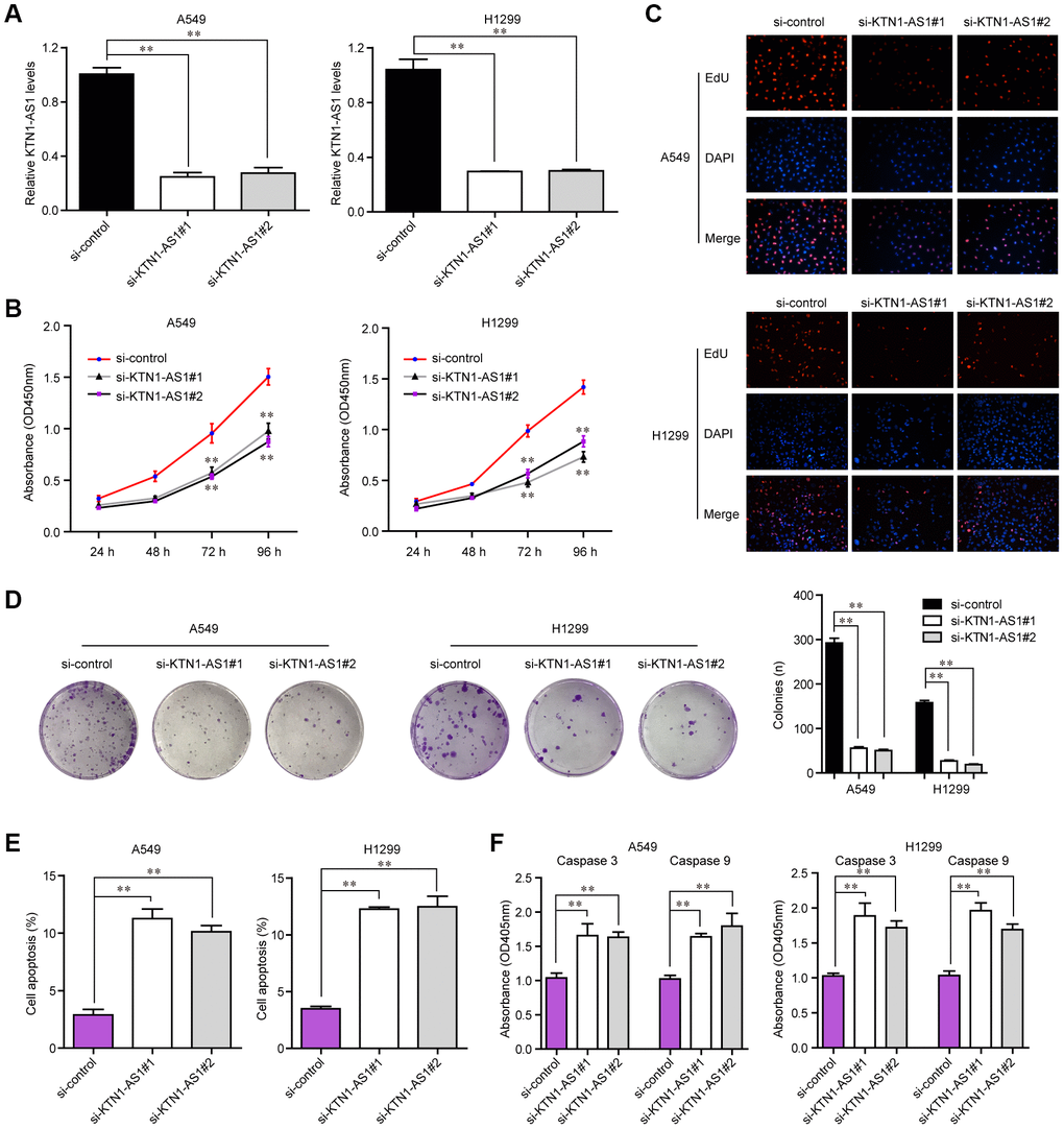To explore the influence of altered KTN1-AS1 expression on NSCLC cells, we first performed qPCR to verify the knockdown efficiency of si-KTN1-AS1#1 and si-KTN1-AS1#2 in lung cancer cells, and the results suggested that these siRNAs had high knockdown efficiency for silencing KTN1-AS1 expression (Figure 3A). Then, we conducted CCK-8 assays to evaluate the influence of KTN1-AS1 depletion on cellular growth. The data clarified that KTN1-AS1 deficiency led to remarkable inhibition of lung cancer cell proliferation (Figure 3B). Similarly, the EdU assays also revealed that the proliferation of lung cancer cells was markedly decreased after KTN1-AS1 expression was silenced (Figure 3C). Furthermore, clonogenic assays also demonstrated that the colony formation abilities of lung cancer cells were notably suppressed after KTN1-AS1 was knocked down (Figure 3D). In addition, the effects of changed KTN1-AS1 expression on cellular apoptosis were also evaluated, and the results indicated that KTN1-AS1 depletion induced markedly cell apoptosis (Figure 3E). Mechanically, the caspase 3/9 activities in lung cancer cells after KTN1-AS1 depletion were determined, and we found that silencing KTN1-AS1 expression caused significantly increased caspase 3/9 activities (Figure 3F). These findings validated that the cell proliferation was suppressed, while the apoptosis was enhanced in KTN1-AS1-deficiency lung cancer cells.