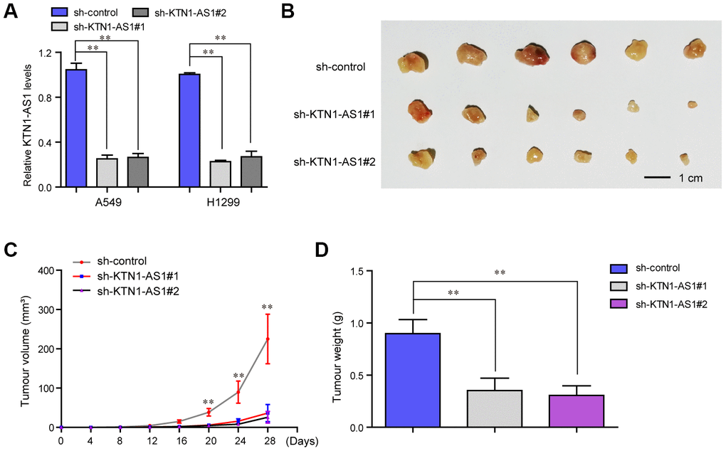 To explore the effects KTN1-AS1 on lung cancer tumorigenicity in vivo, we established xenograft tumor models by using the A549 cells in nude mice. We first generated recombinant lentivirus carrying shRNA targeting KTN1-AS1 (sh-KTN1-AS1#1, sh-KTN1-AS1#2), and this lentivirus was then respectively used for infecting lung cancer cells. The qPCR analyses suggested that the lentivirus had high knockdown efficiency in lung cancer cells (Figure 4A). Subsequently, we subcutaneously injected A549 cells with KTN1-AS1 depletion into the nude mice. After four weeks, the mice were sacrificed and the weight of each tumor was measured. The tumors in each group were shown in Figure 4B. The results presented that the tumor volumes in the KTN1-AS1-deficiency groups were remarkably smaller than that in the sh-control group, indicating that repressing KTN1-AS1 expression could markedly abrogate the tumor growth (Figure 4C). Besides, the data suggested that lower tumor weights were found in the KTN1-AS1-depletion groups (Figure 4D). Taken together, these results demonstrated that KTN1-AS1 was crucial for NSCLC tumor growth in vivo and the findings further indicated that KTN1-AS1 was able to potentially serve as a new therapeutic target in NSCLC treatment.