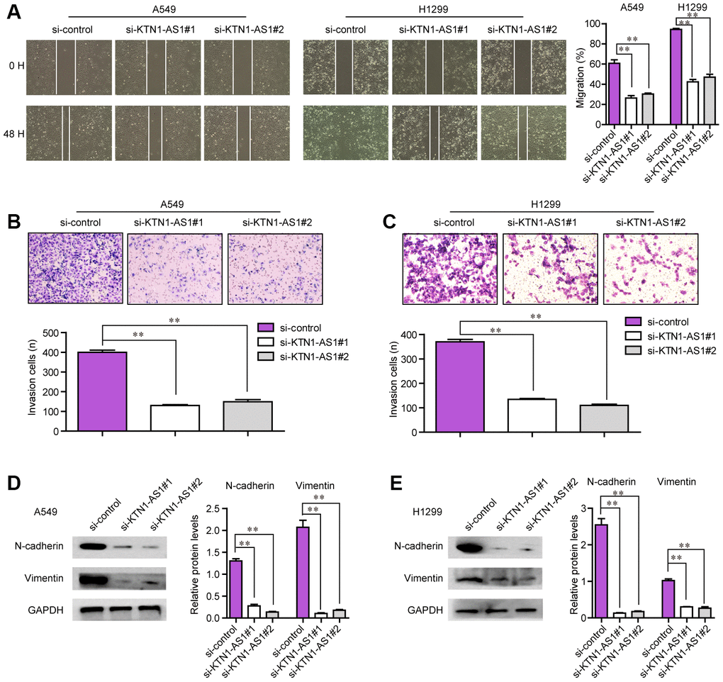 The tumor cell invasion and migration were also major features that contributed to tumor development and progression. Therefore, we next attempted to explore whether KTN1-AS1 could modulate the metastatic potentials of NSCLC cells. To achieve that, wound-healing and transwell assays were conducted. The wound-healing assays presented that, within 48 h after transfection, NSCLC cells transfected with KTN1-AS1 siRNAs exhibited notably bigger gap distance than that treated with si-control, which indicated that KTN1-AS1 depletion caused significant inhibition of NSCLC cell migration (Figure 5A). Furthermore, transwell assays revealed that KTN1-AS1 siRNAs-transfected groups had a markedly smaller number of invaded cells when compared with the corresponding control group (Figure 5B, 5C). Since altered KTN1-AS1 expression influenced the metastatic capacities of NSCLC cells, we next sought to assess whether the levels of epithelial-to-mesenchymal (EMT) related molecules (N-cadherin and vimentin) were changed in NSCLC cells after KTN1-AS1 was knocked down. The data from western blot assays revealed that depression of KTN1-AS1 contributed to obvious suppression of N-cadherin and vimentin protein levels (Figure 5D, 5E). Collectively, our findings suggested that KTN1-AS1 depletion attenuated the metastatic potentials of NSCLC cells.