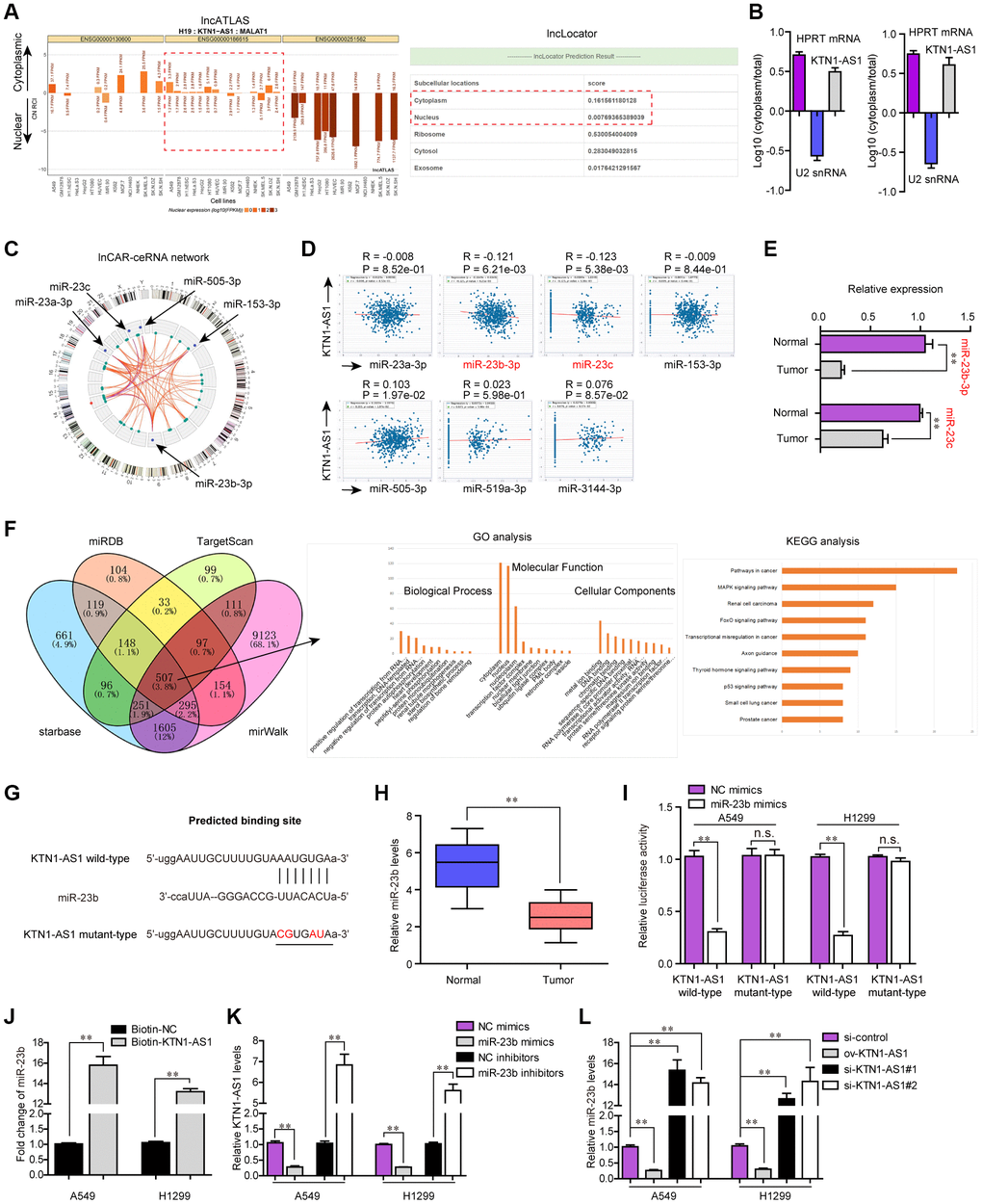 Afterwards, we sought to explore the mechanisms by which KTN1-AS1 served as crucial roles in NSCLC tumorigenesis. It is well known that lncRNAs, especially those exhibited in cytoplasm, exert their regulatory functions via acting as ceRNA [18]. Thereby, we first applied bioinformatics tools (lncATLAS and lncLocator) to predict the subcellular distribution of KTN1-AS1, and the results illustrated that KTN1-AS1 mainly distributed in cytoplasm (Figure 6A). Subsequently, the subcellular fractionation assays also validated that KTN1-AS1 mainly located in the cytoplasm of NSCLC cells (Figure 6B). Therefore, we next wondered whether any miRNAs might involve in KTN1-AS1 induced NSCLC tumorigenesis. To achieve that, bioinformatics analysis using lnCAR program was performed to construct the ceRNA network of KTN1-AS1, and five miRNAs (including miR-23a, miR-23b and miR-23c) were found to be in the network (Figure 6C). In addition, the starBase program was used for predicting the potential miRNA targets of KTN1-AS1 and among these miRNAs, the expression of only miR-23b and miR-23c was significantly (P < 0.01) negatively correlated with KTN1-AS1 expression in NSCLC specimens (Figure 6D). Hence, we next randomly selected three paired NSCLC tumor tissues and normal specimens to examine the levels of miR-23b and miR-23c, and the data from qPCR analysis showed that miR-23b levels were notably lower than that of miR-23c in NSCLC tumor tissues (Figure 6E). Therefore, we next sought to focus on miR-23b, a widely-reported tumor suppresser in diverse cancers. Indeed, GO and KEGG analysis of the common targets which were obtained by intersecting the results of miRDB, TargetScan, starBase and miRWalk, revealed that miR-23b was associated with pathways in cancer (Figure 6F). We thereby attempted to explore whether miR-23b was a target of KTN1-AS1 in NSCLC cells. The predicting binding sequence between KTN1-AS1 and miR-23b was presented in Figure 6G. Notably, qPCR analyses demonstrated that miR-23b levels were markedly decreased in 127 NSCLC tissues compared to normal samples (Figure 6H). Afterwards, the luciferase reporter assays were conducted and the results presented that miR-23b mimics obviously repressed the activity of KTN1-AS1 wild-type reporter plasmids, indicating that KTN1-AS1 directly sponged miR-23b (Figure 6I). Furthermore, RNA pulldown assays revealed that KTN1-AS1 could precipitate miR-23b in NSCLC cells (Figure 6J). Moreover, we also observed that ectopic expression of miR-23b notably suppressed KTN1-AS1 expression, while miR-23b depletion led to significantly increased KTN1-AS1 levels (Figure 6K). Similarly, qPCR analysis also indicated that KTN1-AS1 overexpression remarkably promoted miR-23b expression, while KTN1-AS1 deficiency caused markedly decreased KTN1-AS1 levels (Figure 6L). To sum up, the results validated that KTN1-AS1 was capable to sponge miR-23b to suppress its expression in NSCLC cells.