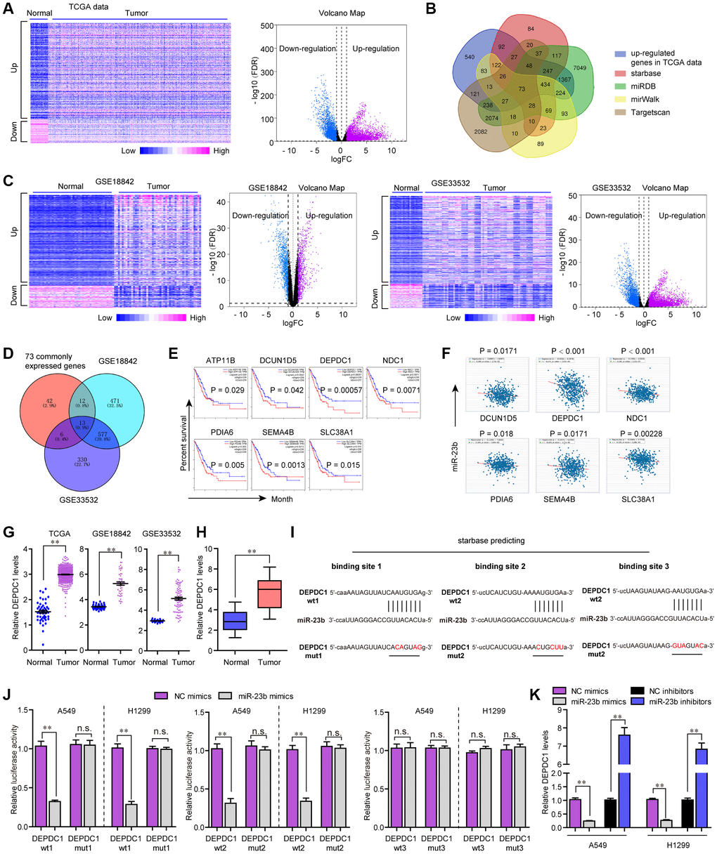 MiRNAs are widely reported to modulate their downstream targets at post-transcriptional level. Therefore, we next aimed to uncover the potential target gene of miR-23b in NSCLC. For that purpose, we firstly conducted bioinformatics analysis to analyze the TCGA dataset and found the differentially express genes (DEGs) in NSCLC tumor specimens. The heatmap and volcano map of these DEGs were presented in Figure 7A. Thereafter, the up-regulated genes were intersected with the results of miRDB, TargetScan, starBase and miRWalk, and we obtained 73 common genes (Figure 7B). Besides, we analyzed DEGs in another two microarray profiles (GSE18842 and GSE33532), and the heatmaps and volcano maps were shown in Figure 7C. Afterwards, we intersected the above 73 common genes with the up-regulated genes in GSE18842 and GSE33532 data, and we found 13 commonly expressed genes (Figure 7D). Subsequently, GEPIA algorithm was used for analyzing the overall survivals of these 13 genes, and we found only 7 genes were significantly (P < 0.05) correlated with overall survivals (Figure 7E). Then, we conducted expressing correlation analysis using starBase program, and we found that, among these 7 genes, only six of them were significantly (P < 0.05) positively correlated with KTN1-AS1 expression in NSCLC samples (Figure 7F).