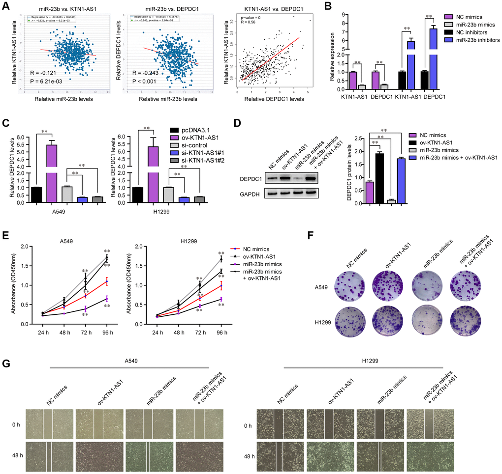 Next, the expressing relationships among KTN1-AS1, miR-23b and DEPDC1 were further investigated. Expressing correlation analysis using starBase and GEPIA algorithms revealed that miR-23b expression was negatively correlated with both KTN1-AS1 and DEPDC1, and KTN1-AS1 levels were positively correlated with DEPDC1 expression in NSCLC tumor specimens, which was consistent with the above observation that KTN1-AS1 sponged miR-23b and miR-23b directly targeted DEPDC1 (Figure 8A). In addition, qPCR analysis also clarified that forced expression of miR-23b caused significantly decreased levels of both KTN1-AS1 and DEPDC1, while repressing miR-23b expression led to significantly increased KTN1-AS1 and DEPDC1 expression (Figure 8B). Next, we sought to investigate whether KTN1-AS1 could directly modulate the expression of DEPDC1 in NSCLC cells. The results from qPCR assays demonstrated that overexpressing KTN1-AS1 (ov-KTN1-AS1) was capable to enhance DEPDC1 expression (Figure 8C). On the contrary, the DEPDC1 levels were depressed in lung cancer cells after their KTN1-AS1 was silenced. Afterwards, western blot was also conducted for evaluating the changes of DEPDC1 protein levels in A549 cells after treatment. The results confirmed that though miR-23b was capable to inhibit DEPDC1 expression, re-introduction of KTN1-AS1 was able to restore the protein levels which were suppressed by miR-23b mimics (Figure 8D). All these data demonstrated that KTN1-AS1 was capable to regulate DEPDC1 expression via targeting miR-23b. Next, we sought to investigate whether KTN1-AS1 could rescue the inhibitory effects of miR-23b on malignant behaviors of NSCLC cells. CCK-8 assays validated that enhancing KTN1-AS1 expression could significantly restore the cellular growth which was abrogated by transfecting miR-23b mimics (Figure 8E). Similar results that KTN1-AS1 overexpression rescued the colony formation abilities which were suppressed by miR-23b mimics, were also observed (Figure 8F). Although miR-23b was able to attenuate the migration of NSCLC cells, KTN1-AS1 overexpression could also restore the inhibitory influence of miR-23b on cellular migration (Figure 8G). Overall, these data suggested that KTN1-AS1 could modulate the malignancies of NSCLC via miR-23b/ DEPDC1 axis.