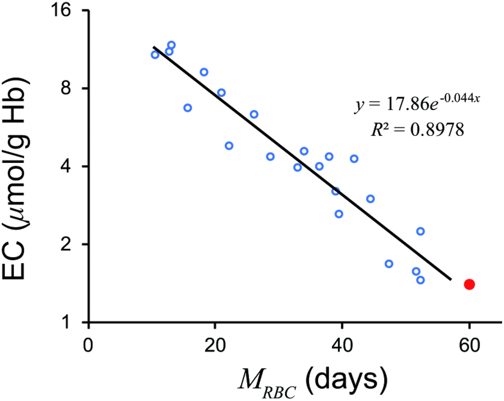 A standard value of EC of 1.4 μmol/g Hb gives an MRBC of 58.14 days.