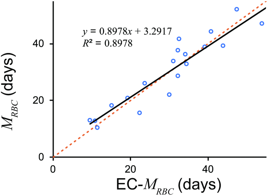 We estimated MRBC by multiplying the half life of 51Cr by 2.61. As human erythrocytes do not obey the Poisson process [16], the term “half-life” is not entirely suitable for erythrocytes. Fehr et al. [13] determined 51Cr half-life, the elution-corrected 51Cr half-life, and the mean cell lifespan. The mean cell lifespan was not recorded in their table. The elution-corrected 51Cr half-life would provide an estimate of MRBC, considering that normal erythrocytes in a human have a similar lifespan [16]. However, their elution-corrected 51Cr half-life seems less concordant with EC rank. Complicated procedures sometimes reduce the stability of the system. Therefore, we chose the simple uncorrected 51Cr half-life in the same way as Fehr et al. [13]. Considering that MRBC for normal erythrocytes is about 60 days, and the normal range of 51Cr half-life was 23 – 27 days, multiplying 51Cr half-life by 2.61 (= 60/23) provides a good estimation of MRBC in practice.