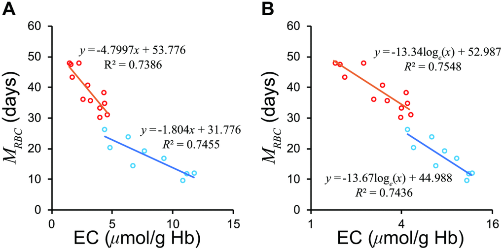 Although Fehr et al. [13] divided patients into a severe hemolytic disease group and a group with milder forms of hemolysis, our model suggested that logarithm of EC may combine the two groups (Figure 3). The regression formula passed close to a standard value of EC, 1.4 μmol/g Hb and 60 days of MRBC, which proves the validity of the formula.