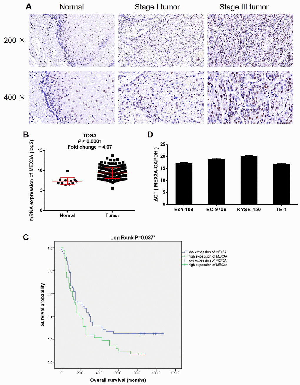 MEX3 protein was first discovered by Draper et al. in Caenorhabditis elegans. It is a translation regulator that can inhibit Pal-1 translation in early embryos of Caenorhabditis elegans [18]. MEX3 protein is a RNA-bound phosphoprotein, with two tandem repetitive heterogenous ribonucleoprotein K homologous (KH) domains at the N-terminal and a ring finger domain at the C-terminal. Through the KH domain, MEX3 binds to mRNA and shuttles between nucleus and cytoplasm through CRM1-dependent pathway, thus translating, regulating and degrading mRNA. Human MEX3 protein may mediate ubiquitination of target protein through ring finger domain, thus regulating its stability and subcellular localization [19–21]. As one of the MEX3 homologous genes, MEX3A also participates in the regulation of mRNA and may mediate the occurrence and development of many diseases, such as cancer. Till now, the role of MEX3A has been elucidated in several types of human cancer including gastric cancer, colorectal cancer and nephroblastoma [22–24]. However, the association between MEX3A and ESCC is still unclear.