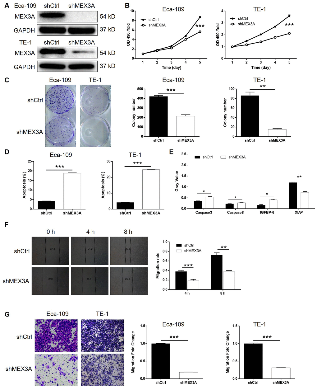 Given the successful construction of MEX3A knockdown cell models, we next investigated its role in ESCC in vitro. The results of MTT assay showed that, after knockdown of MEX3A, cell proliferation was decreased in Eca-109 and TE-1 cells (P < 0.001, Figure 2B). It was also demonstrated that, in shMEX3A group, obviously less colonies were formed compared with shCtrl group after 14 days of Eca-109 and TE-1 cell culture, respectively (P < 0.01, Figure 2C). The detection of cell apoptosis by flow cytometry showed apparently increased apoptotic cell percentage in shMEX3A group compared with shCtrl group of Eca-109 and TE-1 cells, respectively, indicating the ability of MEX3A knockdown to induce cell apoptosis (P < 0.001, Supplementary Figure 2A and 2D). Moreover, the effects of MEX3A knockdown on apoptosis related proteins were screened by a Human Apoptosis Antibody Array based on TE-1 cells with or without MEX3A knockdown (Supplementary Figure 2B). The results indicated that MEX3A knockdown caused the upregulation of Caspase3, Caspase8 and IGFBP-6, and downregulation of XIAP (P < 0.05, Figure 2E). Furthermore, the effects of MEX3A knockdown on cell motility were evaluated by wound healing and Transwell assays simultaneously. As shown in Figure 2F, upon MEX3A knockdown, cell migration rate was significantly decreased in TE-1 cells (P < 0.01). Similar results were also obtained from Transwell assay (P < 0.001, Figure 2G). In summary, these results suggested that knockdown of MEX3A could inhibit the development of ESCC in vitro.
