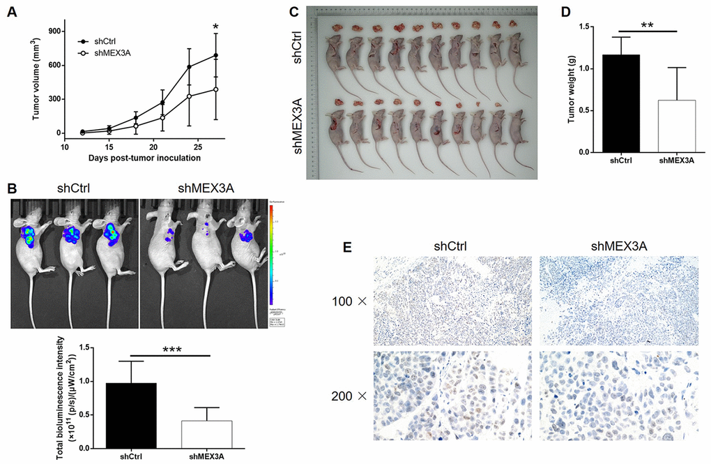 In order to further explore the effects of MEX3A on development of ESCC in vivo, mice xenograft models were established through injection of TE-1 cells with or without MEX3A knockdown. Tumor volume was measured throughout the culture of animal models, which showed significantly slower growth of tumors in shMEX3A group (P < 0.05, Figure 3A). Before sacrificing the mice, in vivo imaging of tumors was facilitated by injection of D-Luciferin and showed obviously weaker luminescence intensity, as well as smaller tumor, in shMEX3A group (P < 0.001, Figure 3B). Following the sacrifice of animal models, the photos of the tumors were collected (Figure 3C) and weights were measured (P < 0.01, Figure 3D), both indicating smaller tumors in shMEX3A group. Moreover, the Ki-67 expression in sections of tumors collected from both groups was assessed by IHC and demonstrated significantly lower expression in shMEX3A group compared with shCtrl group (Figure 3E). All the above results suggested that knockdown of MEX3A could suppress tumor growth of ESCC in vivo.