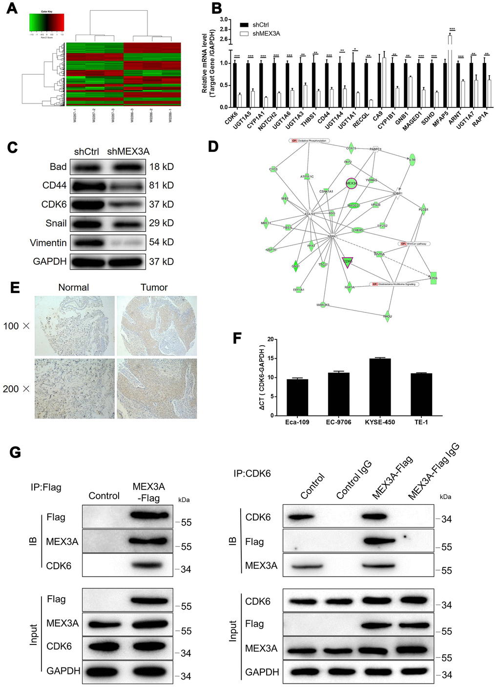For exploring the mechanism underlying the inhibition of ESCC by MEX3A knockdown, RNA sequencing was performed to obtain the gene expression profiling in TE-1 cells with or without MEX3A knockdown (3 v 3). In total, 314 differentially expressed genes (DEGs) were identified, among which 117 were upregulated and 197 were downregulated (Figure 4A and Supplementary Figure 3A, 3B). Subsequently, IPA analysis based on all the DEGs revealed the most enriched canonical signaling pathway (Supplementary Figure 3C). The analysis of IPA disease & function indicated that the most favorable one regulated by MEX3A was cancer (Supplementary Figure 3D). Moreover, several most downregulated DEGs in shMEX3A group were subjected to qPCR and western blotting for detecting their mRNA or protein levels in Eca-109 cells, which identified CDK6 as a promising downstream of MEX3A (P < 0.05, Figure 4B and 4C). Further combining the the analysis of MEX3A-related interaction network, we supposed that MEX3A knockdown may execute its function in ESCC through downregulating CDK6 (Figure 4D). The following detection of CDK6 in ESCC tissues and normal tissues confirmed this speculation by showing significant downregulation of CDK6 in ESCC (Figure 4E). The background expression of CDK6 in ESCC cell lines was further detected by qPCR and also showed high expression in Eca-109, EC-9706, KYSE-450 and TE-1 cells (Figure 4F). More importantly, our preliminary investigation of the underlying mechanism between MEX3A and CDK6 by co-IP assay revealed the direct interaction between them (Figure 4G). All the above results identified CDK6 as a potential downstream of MEX3A in the promotion of ESCC.