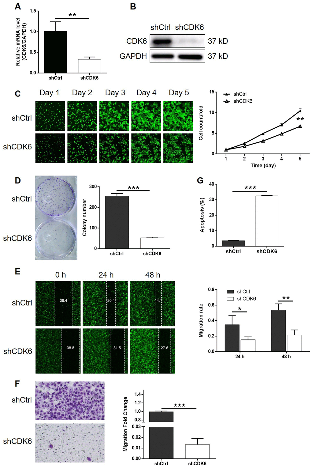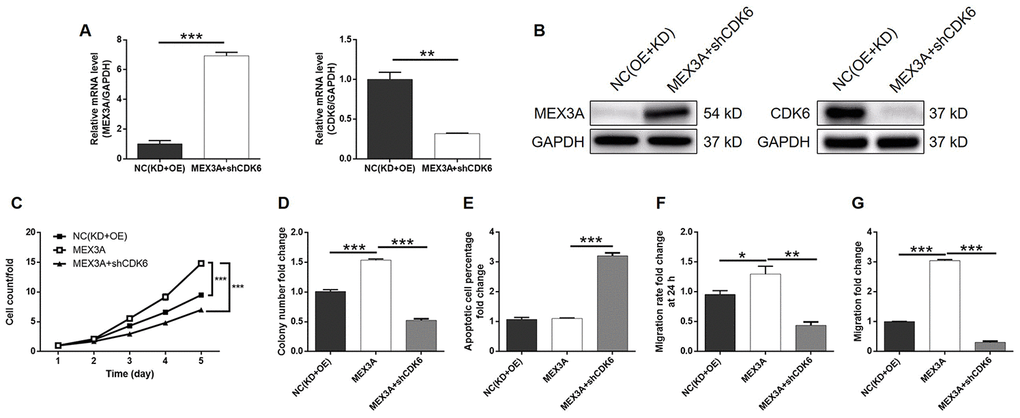 In order to investigate the synergistic effect of MEX3A and CDK6 on the development of ESCC, Eca-109 cells with MEX3A overexpression (MEX3A group), CDK6 knockdown (shCDK6 group) and simultaneous MEX3A overexpression and CDK6 knockdown (MEX3A+shCDK6 group) were constructed and verified using abovementioned method (Supplementary Figure 4A). Following the verification of CDK6 knockdown by qPCR (67.3% knockdown) and western blotting (P < 0.01, Figure 5A and 5B), detection of cellular functions demonstrated 35.8%, 79.3%, 59.9% (wound-healing assay) and 98.7% (Transwell assay) inhibition of cell proliferation, colony formation and cell migration, respectively (P < 0.01, Supplementary Figures 4B and 5C–5F), as well as 9.0-fold increase of cell apoptosis (P < 0.001, Figure 5G) in shCDK6 group. These results suggested a similar role of CDK6 in ESCC with MEX3A. Conversely, MEX3A overexpression induced 1.56-fold, 1.52-fold and 1.32-fold (wound-healing assay) and 3.05-fold (Transwell assay) elevation of cell proliferation, colony formation and cell migration (P < 0.05, Supplementary Figure 5A–5F), however showing ignorable effects on cell apoptosis (Supplementary Figure 5G). More importantly, we found that, with upregulated expression of MEX3A and downregulated expression of CDK6 in MEX3A+shCDK6 group (P < 0.01, Figure 6A and 6B), the effects of MEX3A overexpression on cell proliferation, colony formation, cell apoptosis and cell migration could be significantly alleviated even reversed by CDK6 knockdown (P < 0.05, Supplementary Figure 6 and Figure 6C–6G).