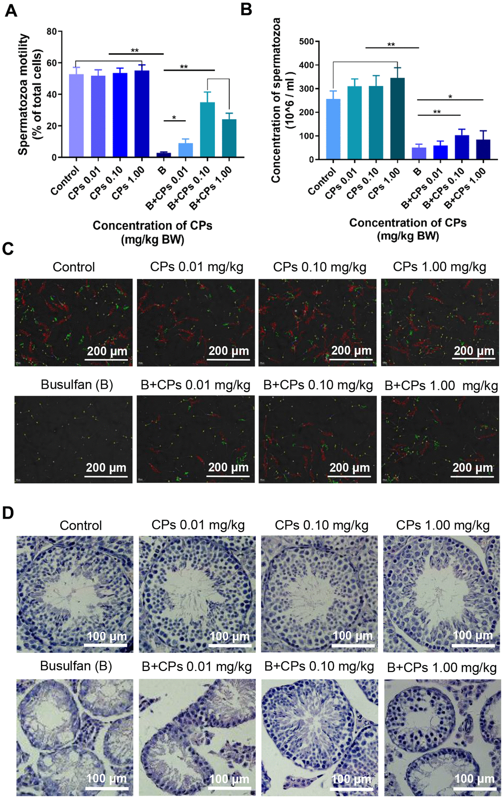 Busulfan was used as a model compound to create an infertile animal model as it has been frequently used in recent published articles [38, 39]. CPs were brought from Wo Te Lai Si biotechnology co., LTD (Lan Zhou, China). We set out to examine the remedial efficacy of CPs on busulfan-exposed murine spermatogenesis and to examine the underlying mechanisms. Male mice under treatment were exposed to busulfan at a concentration of 40 mg/kg and CPs treatment via oral gavage. The concentrations of CPs used in this investigation were 0.01-1.00 mg/kg. The different concentrations of CPs solutions were freshly prepared every day in ultrapure water. There were 8 treatments (10 mice/treatment): (1) vehicle control (ultrapure water); (2) CPs 0.01 mg/kg (CPs 0.01); (3) CPs 0.10 mg/kg (CPs 0.10); (4) CPs 1.00 mg/kg (CPs 1.00); (5) busulfan (B); (6) busulfan + CPs 0.01 mg/kg (B+CPs 0.01); (7) busulfan + CPs 0.10 mg/kg (B+CPs 0.10); (8) busulfan + CPs 1.00 mg/kg (B+CPs 1.00). The volume of fluid used for the oral gavage was 0.10 ml/mouse/day. In this study we chose 3-week-old mice, the gavage took place every morning and lasted for 5 weeks. After 5 weeks, the mice were humanely slaughtered and we collected tissue samples for analysis such as testis, blood, and sperm.