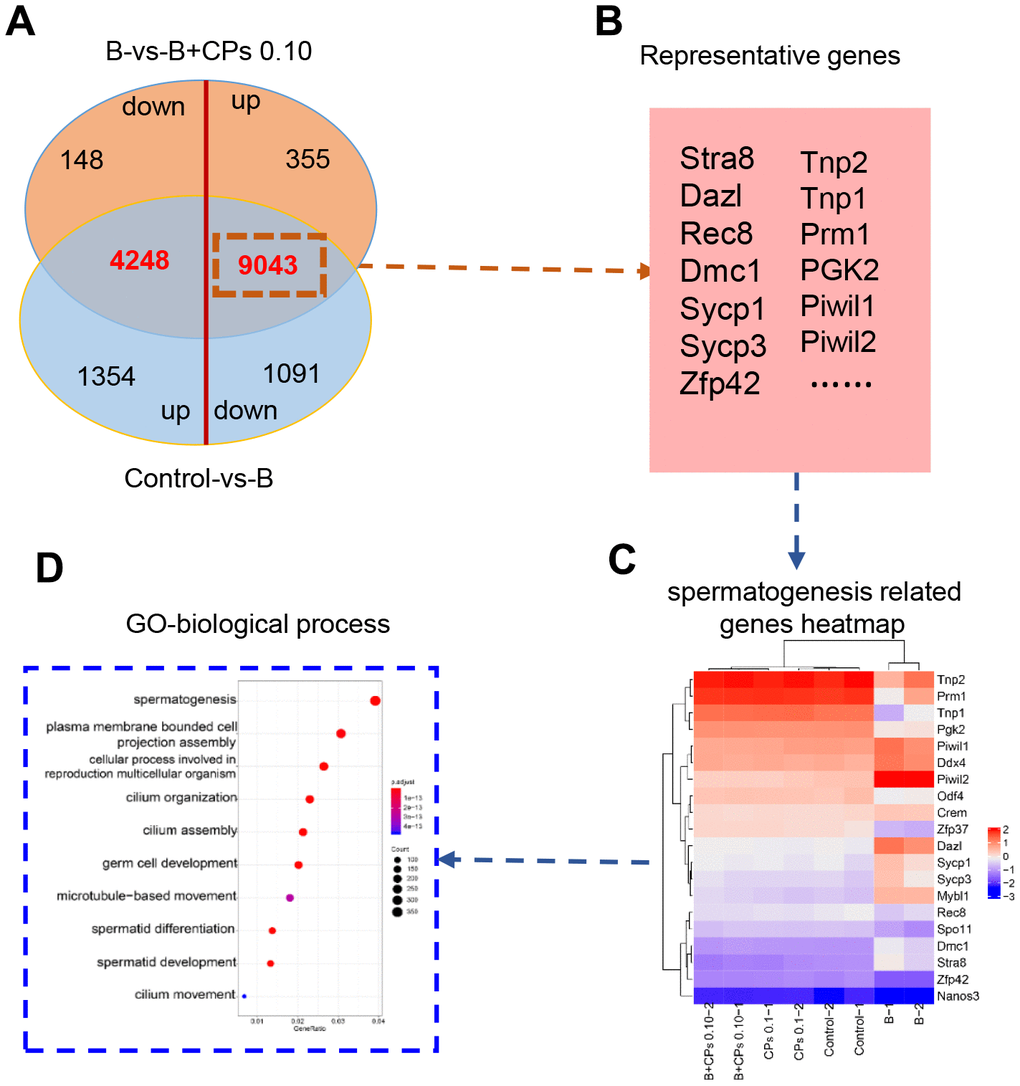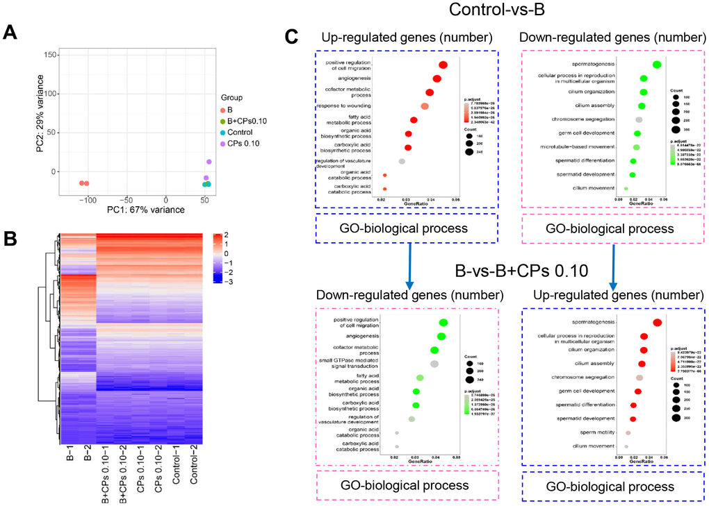First, testicular tissue transcriptomes were determined after busulfan and/or CPs treatments to search for gene expression patterns. Principal components analysis (PCA) showed that the busulfan and control groups were well separated, which suggested that the busulfan treatment produced profound effects on gene expression (Figure 2A). The B+CPs 0.10 mg/kg group overlapped with the control group, which suggested that the CP 0.10 mg/kg group recovered the gene expression that was changed by busulfan (Figure 2A). In total, 52 459 genes were found in the testicular tissues in the current investigation. A total of 15 738 genes were differentially expressed in the Control-vs-B group including 10 136 genes down-regulated and 5602 genes up-regulated. In addition, 13 796 genes were differentially expressed in the B-vs-B+CPs 0.10 mg/kg group including 4398 genes down-regulated and 9398 genes up-regulated (Figure 2B). The functions of these differentially expressed genes (DEGs) were displayed by GO analysis. In the comparison of the Control-vs-B group, the genes decreased by busulfan were enriched during spermatogenesis, germ cell development, and other sperm function related groups; the genes that were increased were in other functional groups (non-sperm related groups). But, in the comparison of the B-vs-B+CPs 0.10 groups, the genes increased by treatment B+CPs 0.10 were enriched during spermatogenesis, germ cell development, and other sperm function related groups, while the decreased genes were enriched in other functional groups (non-sperm related groups). The data suggested that treatment B+CPs 0.10 reversed the disruption of spermatogenesis caused by busulfan (Figure 2C).