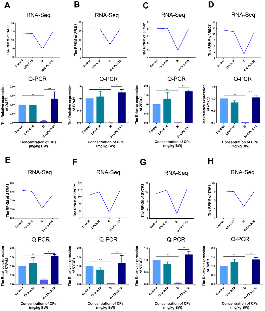 Then we compared the DEGs in Control-vs-B and B-vs-B+CPs 0.10. It was interesting that most of the decreased DEGs in Control-vs-B were increased in B-vs-B+CPs 0.10; while most of the increased DEGs in Control-vs-B were decreased in B-vs-B+CPs 0.10 (Figure 3A). Spermatogenesis is a complex process involving many genes, such as VASA, CREM, SYCP3, DAZL, REC8, PGK2, DMC1, SYCP1, STRA8, and ZFP42. Most of the DEGs that were decreased in Control-vs-B while being increased in B-vs-B+CPs 0.10, were involved in spermatogenesis or reproduction, including STRA8, DAZL, SYCP1, SYCP3, TNP1, etc. (Figure 3B–3D and Supplementary Figure 1). Quantitative RT-PCR (qRT-PCR) was used to verify the RNA-seq data. The expression of eight DEGs was confirmed and the results revealed a similar trend for RNA-seq and qRT-PCR (Figure 4).