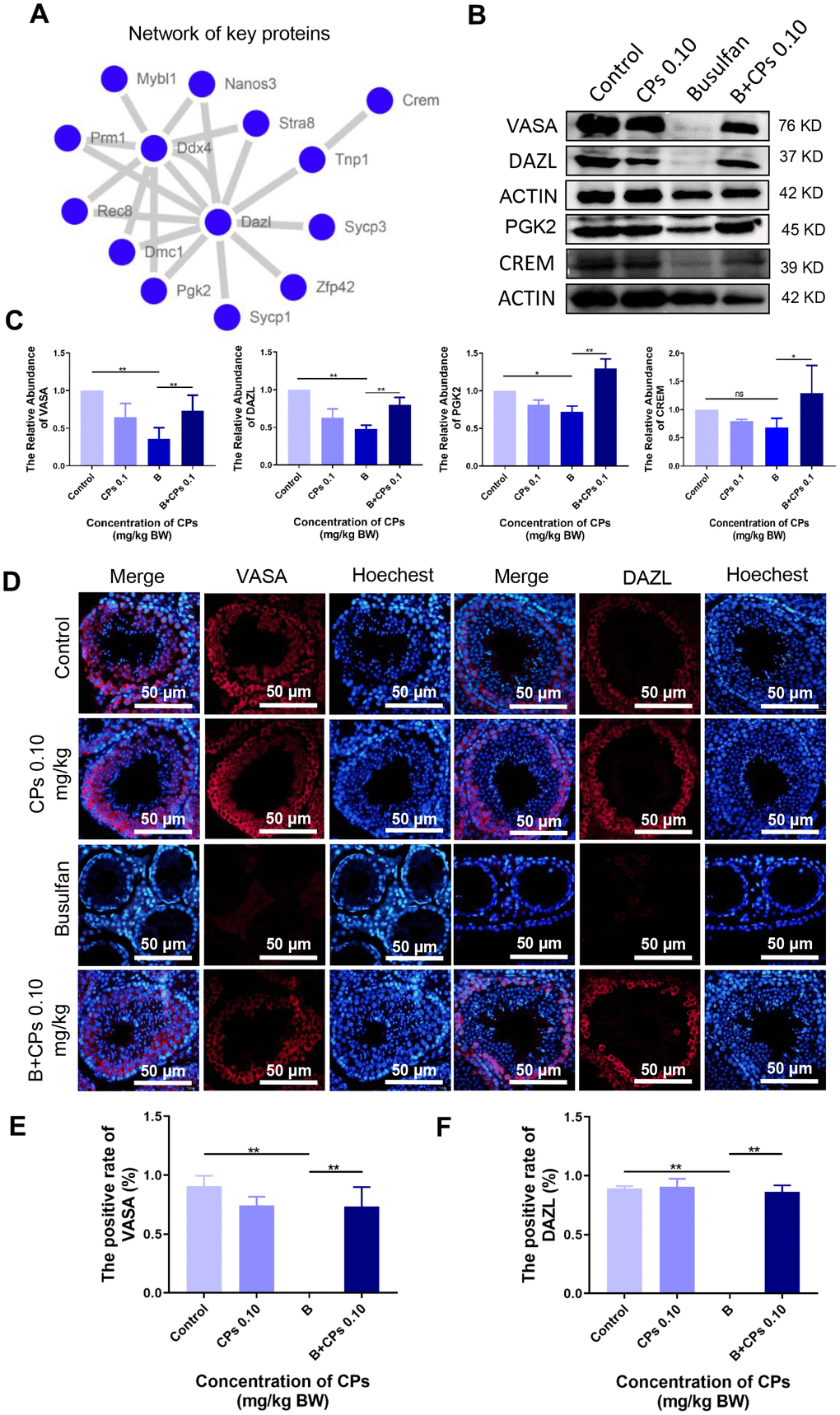 Furthermore, the protein levels of important genes involved in spermatogenesis were determined in the current investigation. Many of these proteins formed a network to regulate spermatogenesis (Figure 5A). Busulfan alone decreased the protein levels of DAZL, PGK2, CREM, and VASA, while B+CPs 0.10 increased these protein levels as revealed by Western blot analysis (Figure 5B, 5C). Immunohistochemistry (IHC) confirmed the protein changes during spermatogenesis. The number of positive cells staining for VASA and DAZL were decreased by busulfan while they were increased by B+CPs 0.10 as seen by IHC (Figure 5D–5F) which confirmed the Western blot analysis data. The data in this section suggested that CPs rescued mouse spermatogenesis through an improvement in the levels of relevant genes and proteins.