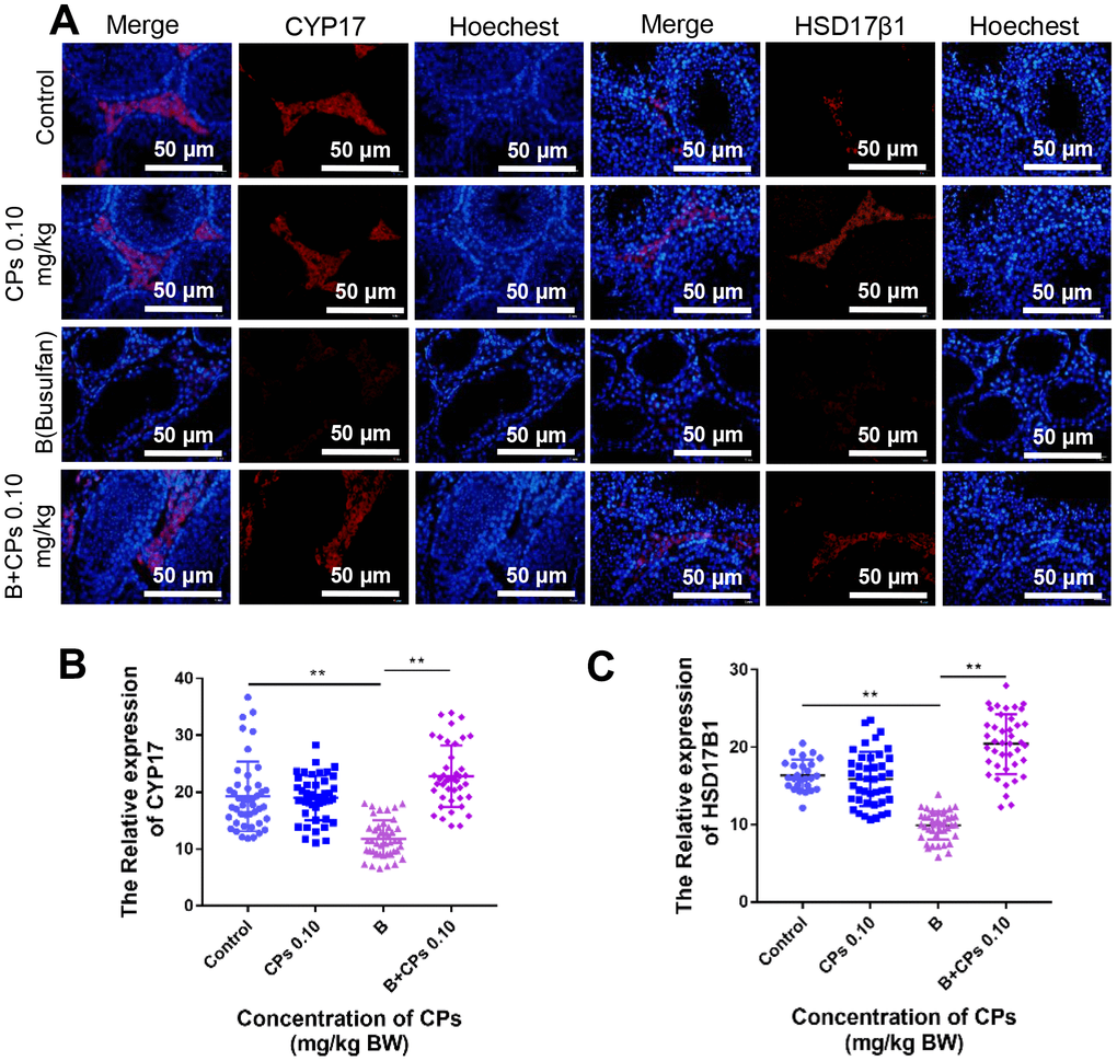 Testosterone and estrogen play vital roles in spermatogenesis and many proteins (or enzymes) are involved in the production of these hormones. We determined these proteins by IHC and found that the levels of CYP17A1, and HSD17β1 were decreased by busulfan while elevated by B+CPs 0.10 (Figure 6A–6C). The data here suggested that CPs 0.10 may improve the local hormones to enhance spermatogenesis.