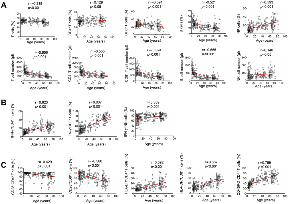 For lymphocyte number, the absolute numbers of total T cells, CD4+ T cells, CD8+ T cells and B cells were all negatively correlated with age. In contrast, both the percentage and absolute number of NK cells were positively correlated with age (Figure 2A). For lymphocyte function, the function of CD4+ and CD8+ T cells was low after birth, but increased with increasing age. Therefore, the function of both CD4+ and CD8+ T cells was positively correlated with age. The function of NK cells was also positively correlated with age. Differently, the function of NK cells was maintained at a high level after birth, and then slowly increased with increasing age (Figure 2B). For lymphocyte phenotype, the expression of naive marker CD28 on both CD4+ and CD8+ T cells was negatively correlated with age. In contrast, the expression of activated marker HLA-DR on them was positively correlated with age. The expression of memory marker CD45RO on CD4+ T cells was also positively correlated with age (Figure 2C).