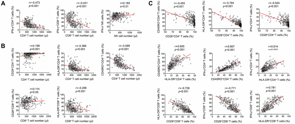 The numbers of CD4+ and CD8+ T cells were negatively correlated with the function of them. In contrast, NK cell number was slightly positively correlated with its function (Figure 3A). The expression of CD28 on CD4+ T cells was positively correlated with the number of CD4+ T cells. Contrastingly, the expression of both HLA-DR and CD45RO on CD4+ T cells was negatively correlated with CD4+ T cell number. HLA-DR expression on CD8+ T cells was also negatively correlated with their number (Figure 3B). Furthermore, CD28 expression on CD4+ and CD8+ T cells was negatively correlated with HLA-DR expression on them. CD28 expression on CD4+ T cells was also negatively correlated with their CD45RO expression. On the other hand, CD28 expression on both CD4+ and CD8+ T cells was negatively correlated with their function. On the contrary, HLA-DR and CD45RO expression on CD4+ and CD8+ T cells was positively correlated with their function (Figure 3C).