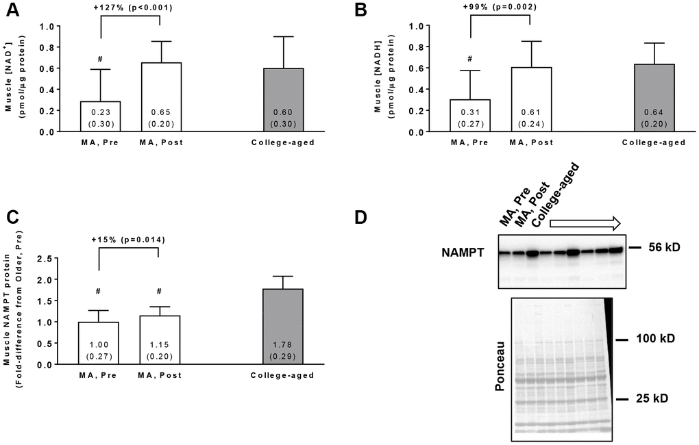 This is the first evidence to suggest resistance training in middle-aged individuals restores muscle NAD+ and NADH concentrations to levels observed in recreationally-trained college-aged individuals. The finding of increased global SIRT activity is also novel, and the current data confirm that resistance training is capable of increasing muscle NAMPT protein levels. Finally, the training-induced increases in muscle mitochondrial density along with the association between increases in muscle citrate synthase activity and NAD+ levels are intriguing and warrant further investigation.