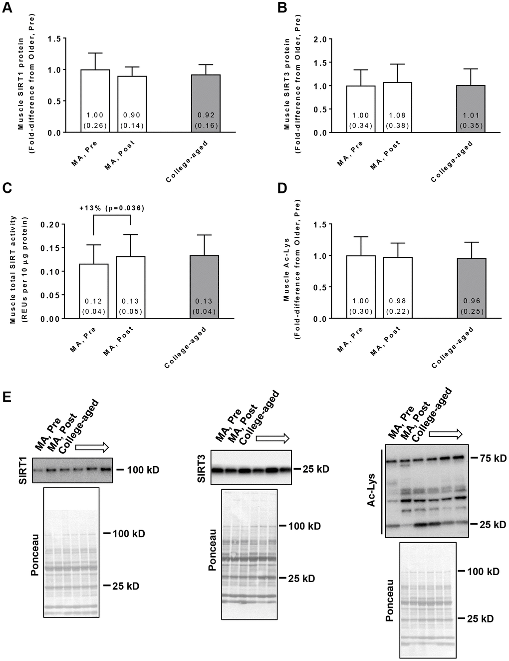 In the MA group, training did not affect muscle SIRT1 protein levels (Pre → Post p=0.210; Figure 2A) or SIRT3 protein levels (Pre → Post p=0.181; Figure 2B). Training did, however, increase global SIRT activity in these participants (Pre → Post p=0.036; Figure 2C). Training in MA participants did not affect acetylated protein levels (Pre → Post p=0.519; Figure 2D). At Pre or Post, values for these variables were similar between MA and college-aged participants. In MA participants, no significant gender×time interactions existed for Pre to Post changes in muscle SIRT1 protein levels (p=0.926), muscle SIRT3 protein levels (p=0.764), muscle SIRT activity levels (p=0.481), or muscle acetylated protein levels (p=0.496).