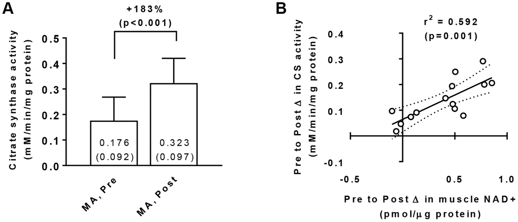 Training increased muscle citrate synthase activity levels in MA participants (Pre → Post p<0.001; Figure 3A) suggestive of increased mitochondrial density, and a significant gender×time interaction did not exist for Pre to Post changes in this marker (p=0.070). Interestingly, there was a significant association between training-induced changes in muscle citrate synthase activity levels and changes in muscle NAD+ concentrations (r2=0.592, p=0.001; Figure 3B). There was also a significant association between training-induced changes in muscle citrate synthase activity levels and changes in muscle NADH concentrations (r2=0.413, p=0.013; not in figure).