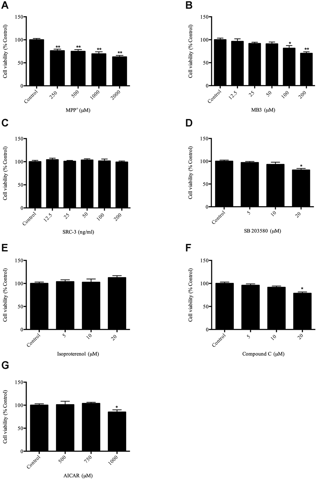 To evaluate the viability of SH-SY5Y cells after treatment with MPP+, SH-SY5Y cells were treated with MPP+ at different concentrations (250–2000 μM) for 24 h. The survival result clearly showed that MPP+ inhibited cell survival in a dose-dependent manner (Figure 1A). According to our result (Figure 1A) and the previous observation [23], the cells exposed to 1000 μM MPP+ as an optimal concentration were selected to establish a cell model of PD for subsequent experiments [20]. Next, to determine optimal concentrations of compounds to be used for this study, the cell viability was measured by MTT assay. Based on the MTT assay, the appropriate concentration of reagents were used for subsequent experiments: MB-3 (50 μM), SRC-3 (100 ng/mL), SB203580 (10 μM), isoproterenol (10 μM), Compound C (10 μM), AICAR (500 μM) (Figure 1B–1G).