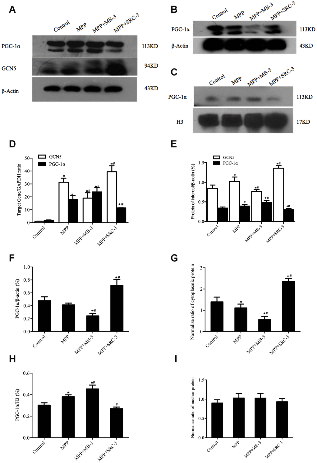Next, we determined whether the distribution of PGC-1α is associated with GCN5 activity. As shown in Figure 2B, 2C, 2F, 2H, the nuclear PGC-1α was significantly increased in response to MPP+ treatment compared with control (P <0.05). In addition, after MPP+ plus MB-3 treatment, the nuclear PGC-1α was increased by 18.01% compared with MPP+ (P <0.05), while the cytosolic PGC-1α was decreased by 42.04% (P <0.05). In contrast, after MPP+ plus SRC-3 treatment, the nuclear PGC-1α was decreased by 28.94% compared with MPP+ (P <0.05), while the cytosolic protein level of PGC-1α was increased by 72.52%. To precisely evaluate the nuclear and the cytosolic distribution of PGC-1α, the nuclear and the cytosolic PGC-1α were normalized to the total protein. The normalized data showed that the cytosolic PGC-1α but not the nuclear PGC-1α was affected by GCN5 activity (Figure 2G, 2I).