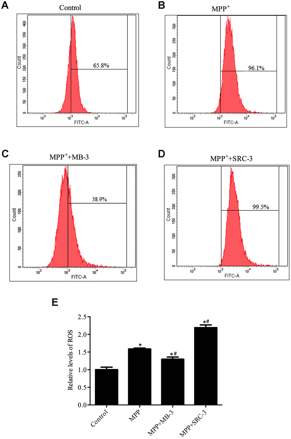 PGC-1α plays an important role in reactive oxygen species (ROS) generation [26]. Therefore, we sought to determine whether manipulation of GCN5 activity with inhibitor MB-3 and activator SRC-3 would affect ROS production in MPP+-mediated neuronal cell toxicity model. First, we tested the direct effect of MPP+ on ROS production in SH-SY5Y cells. There was an increase of 30.3% in ROS-positive cells when treated by MPP+ compared with control (Figure 3). Given that PGC-1α protein is translocated into the nucleus in an early response to oxidative stress, which could attenuate the ROS formation [27] and inhibition of GCN5 by MB-3 causes translocation of PGC-1α from the cytoplasm into the nucleus, we therefore speculated that the number of ROS-positive cells would decrease upon MPP+ (1000 μM) pretreatment following MB-3 (50 μM) treatment. Indeed, a significant decrease in ROS-positive cells (57.2%) was observed in a combined treatment with MPP+ and MB-3 compared with MPP+ treatment only (Figure 3). In contrast, a significant increase in ROS-positive cells (4%) was observed upon MPP+ (1000 μM) pretreatment plus SRC-3 compared to MPP+ treatment only. Taken together, our data indicated that GCN5 activity directly affects ROS levels in SH-SY5Y cells and the ROS production is possibly regulated by the nuclear translocation of PGC-1α.