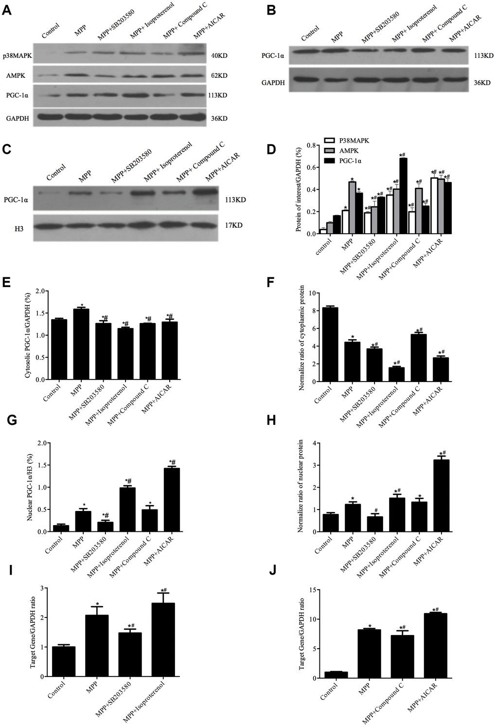 Next, the nuclear and the cytosolic PGC-1α were measured by Western blotting. As shown in Figure 4, compared with MPP+ treatment alone, pretreatment with p38MAPK activator isoproterenol or AMPK activator AICAR resulted in an increase of 85.59% or 25.94% in the total level of PGC-1α protein, respectively (Figure 4A, 4D, P<0.05) as well as an increase of 78.9% or 215.9% in the nuclear PGC-1α, respectively (Figure 4C, 4G, P<0.05) in contrast to a decrease of 27.66% or 22.6% in the cytosolic PGC-1α, respectively (Figure 4B, 4E, P < 0.05). In contrast, the pretreatment with p38MAPK inhibitor SB203580 led to a decrease in the total, the cytosolic and the nuclear levels of PGC-1α, whereas the pretreatment with AMPK inhibitor Compound C only caused a decrease in the total and the cytosolic levels of PGC-1α but not the nuclear levels. Of note, the normalized data demonstrated that the nuclear and the cytosolic levels of PGC-1α changed in opposite directions in response to the treatment with different compounds (Figure 4F, 4H, P<0.05). Together, these data indicated that phosphorylation of PGC-1α by p38MAPK or AMPK directed the redistribution of PGC-1α.
