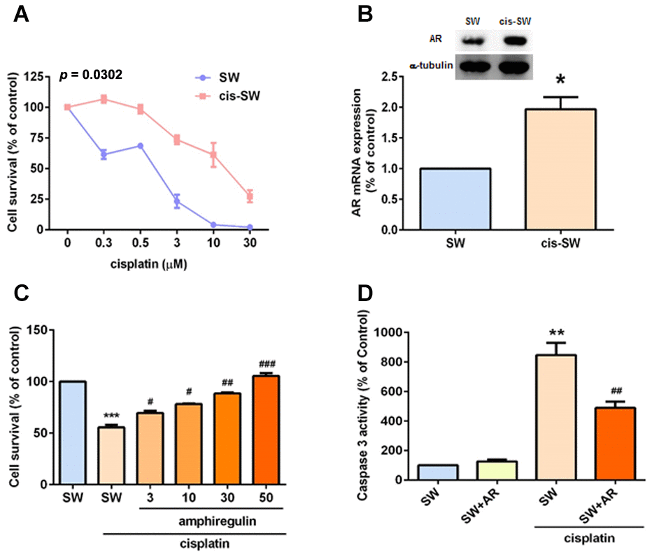 Tumor progression involves members of the EGF/neuregulin family [22], including the EGFR ligand, AR. In several cancers (e.g., ovarian, glioma, head and neck, breast, and lung cancers), high AR expression correlates with worse prognosis [22–24]. In our previous study, we reported that AR enhances chondrosarcoma cell migration and resistance to doxorubicin [25]. We therefore hypothesized that AR may play a role in cisplatin resistance in the treatment of chondrosarcoma. We used the human chondrosarcoma cell line SW1353 to establish cisplatin-resistant cells (cis-SW), which exhibited high levels of survival and AR expression (Figure 1A, 1B). We then pretreated chondrosarcoma cell lines JJ012 and SW1353 with different concentrations of exogenous recombinant AR and found that AR effectively and dose-dependently promoted cell viability in the presence of cisplatin (Figure 1C and Supplementary Figure 1), confirming that AR increases levels of cisplatin resistance in JJ012 and SW1353 cells. Moreover, cisplatin-mediated cell apoptosis was decreased after AR treatment (Figure 1D), according to levels of caspase-3 activity. These data confirm that AR increases levels of cisplatin resistance in chondrosarcoma cells, by inhibiting cisplatin-induced cell apoptosis.