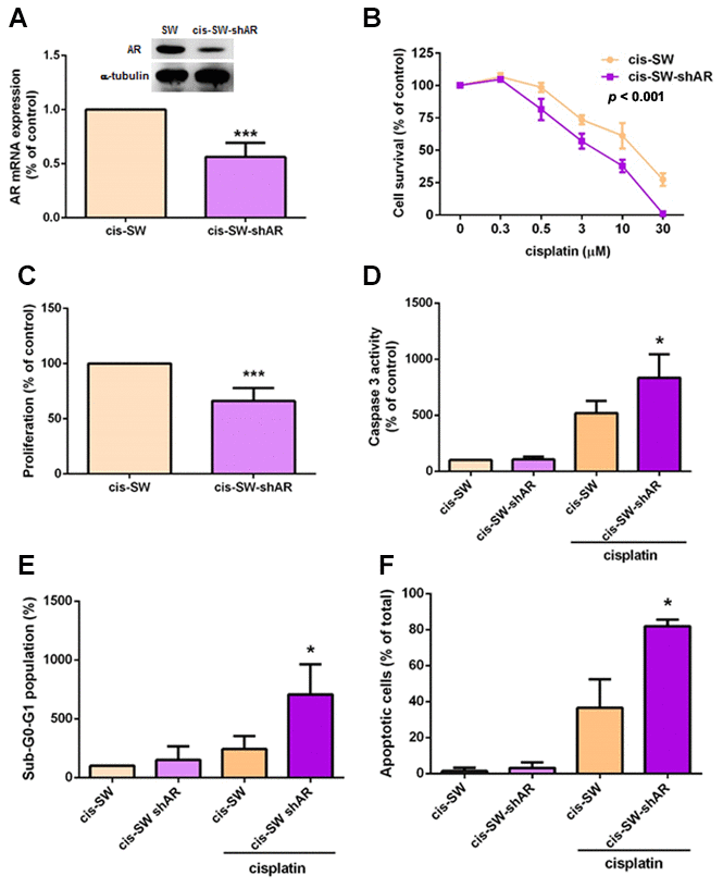 In an attempt to further clarify the role of AR in cisplatin resistance in chondrosarcoma cells, we transfected cis-SW cells with lentivirus expressing AR shRNA (cis-SW-shAR) and Western blot as well as qPCR assays confirmed potent knockdown of AR expression (Figure 2A), with significant inhibition of cell viability and proliferation (Figure 2B, 2C). Furthermore, decreased AR expression promoted cisplatin-induced apoptosis (Figure 2D–2F). These data demonstrate that AR promotes cisplatin resistance in chondrosarcoma cells.