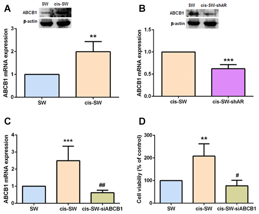ABCB1 confers a multidrug-resistant phenotype in cancers, limiting the absorption and toxicity of chemotherapeutic agents [9]. We therefore speculated that ABCB1 expression correlates with levels of cisplatin resistance in chondrosarcoma cells. As shown in Figure 3A, cis-SW cells expressed high levels of ABCB1 expression, which were significantly decreased when the cells were transfected with lentivirus expressing AR shRNA, as determined by Western blot and qPCR assays (Figure 3B). Furthermore, when we transfected ABCB1 small interfering RNA (siRNA) into cis-SW cells, we observed a significant decrease in levels of ABCB1 mRNA expression (Figure 3C) and a significant decrease in cell viability (Figure 3D). Thus, ABCB1 plays an important role in AR-induced cisplatin resistance in human chondrosarcoma cells.